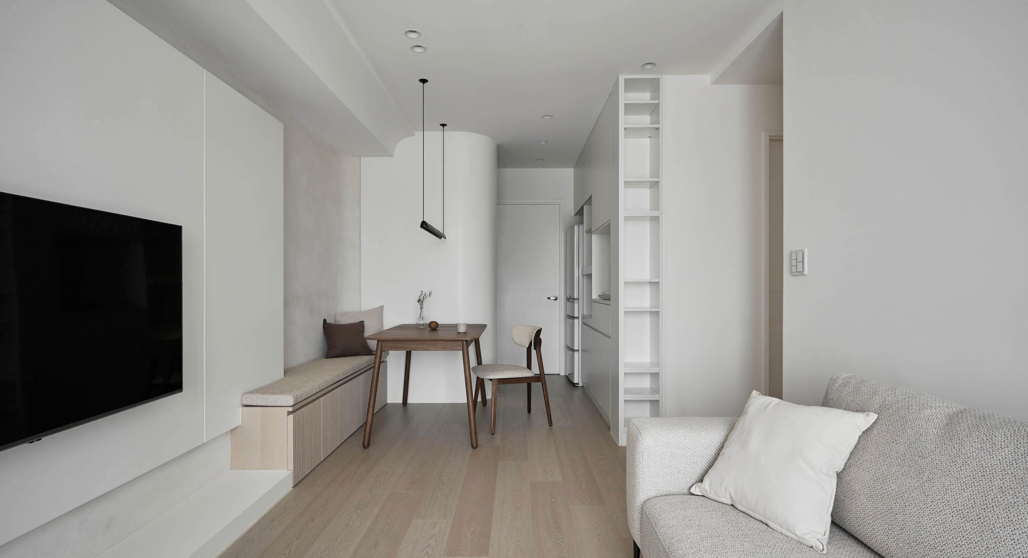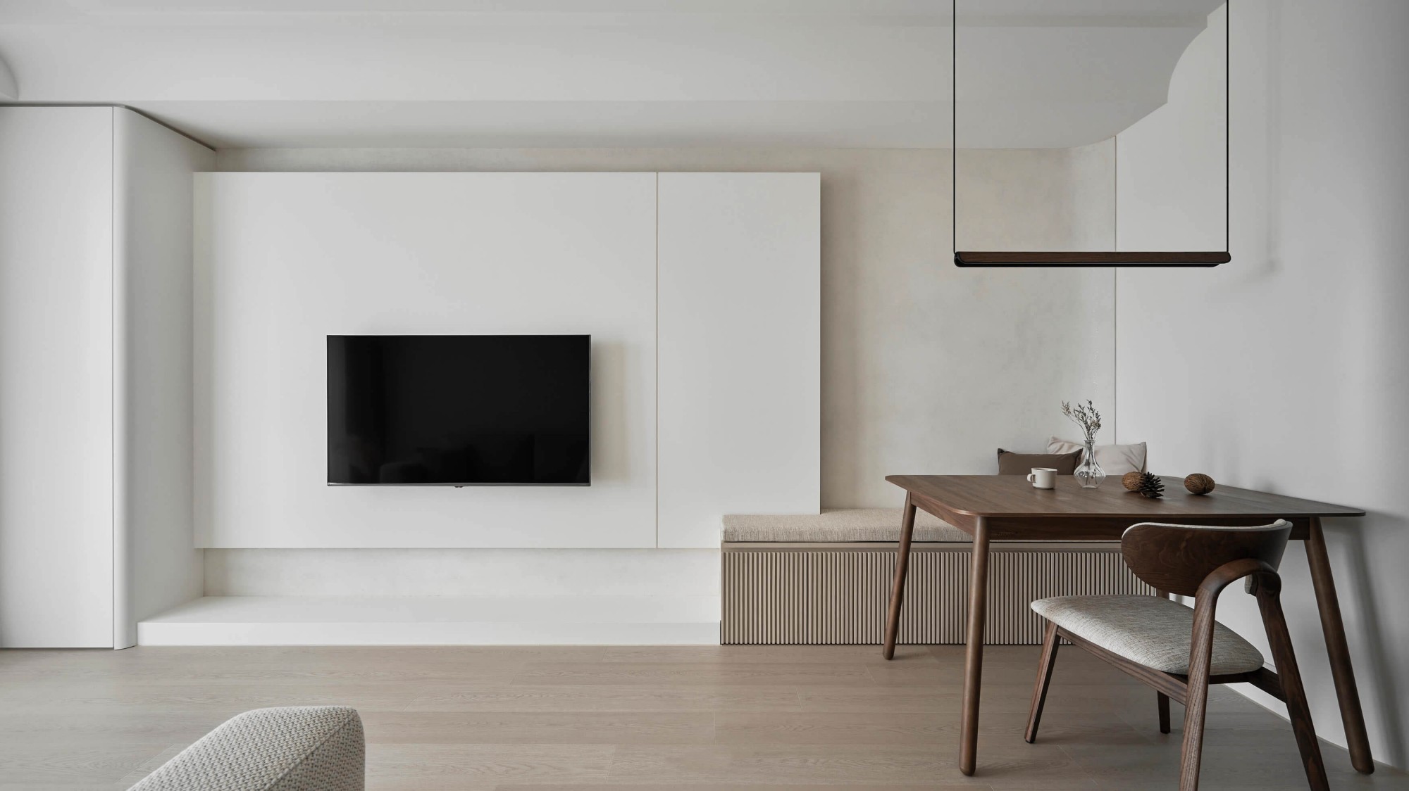 • 餐厨区:胡桃木餐桌和弧形吊顶刚柔相济,卡座藏着收纳,几颗松果、一杯咖啡就把“松弛感”写在了桌上,连墙面肌理都在悄悄柔化边界。