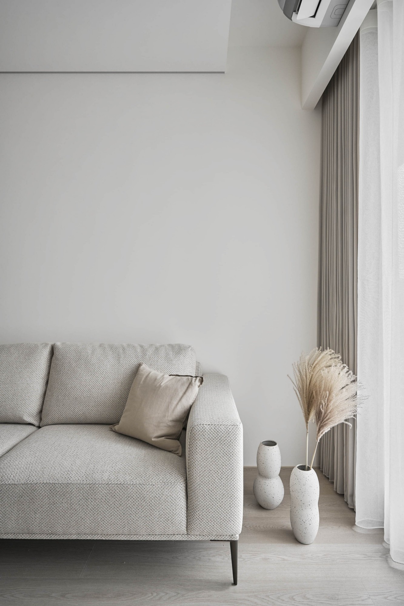 • 客厅:浅麻沙发搭同色系抱枕,带点肌理的陶瓷瓶插着蒲苇,连窗帘都用了“纱+布”的渐变,风一吹就把阳光筛成了软光。