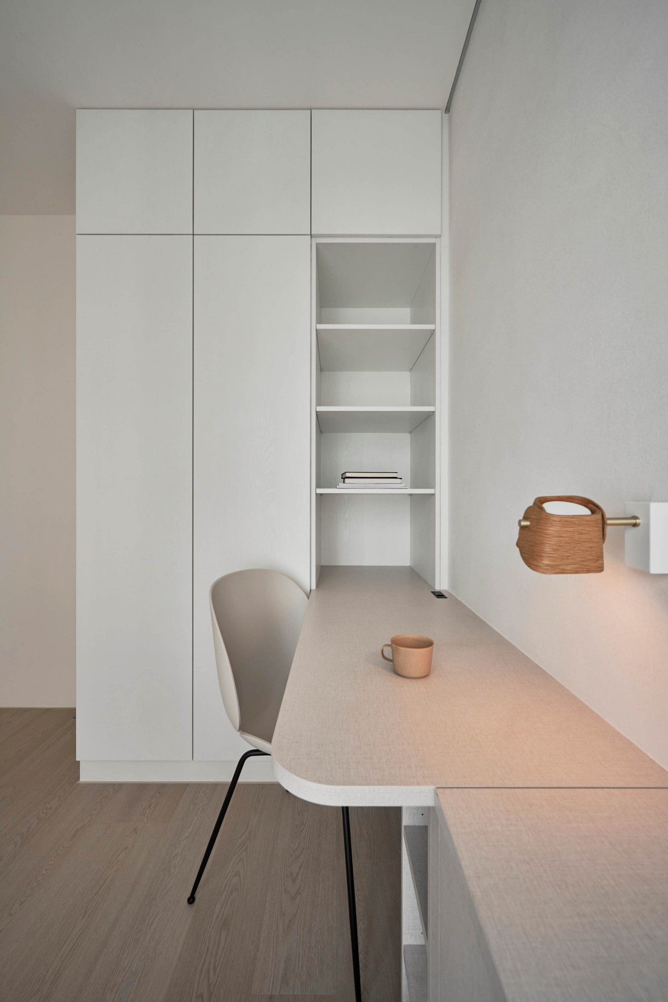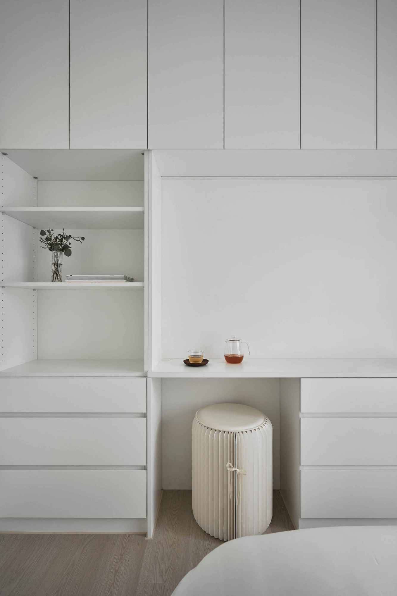 • 卧室:三层窗帘滤出朦胧的窗景,悬浮柜+木饰面床头让空间“轻”下来,全白床品裹着蓬松的软,躺下就是被温柔裹住的安全感。
