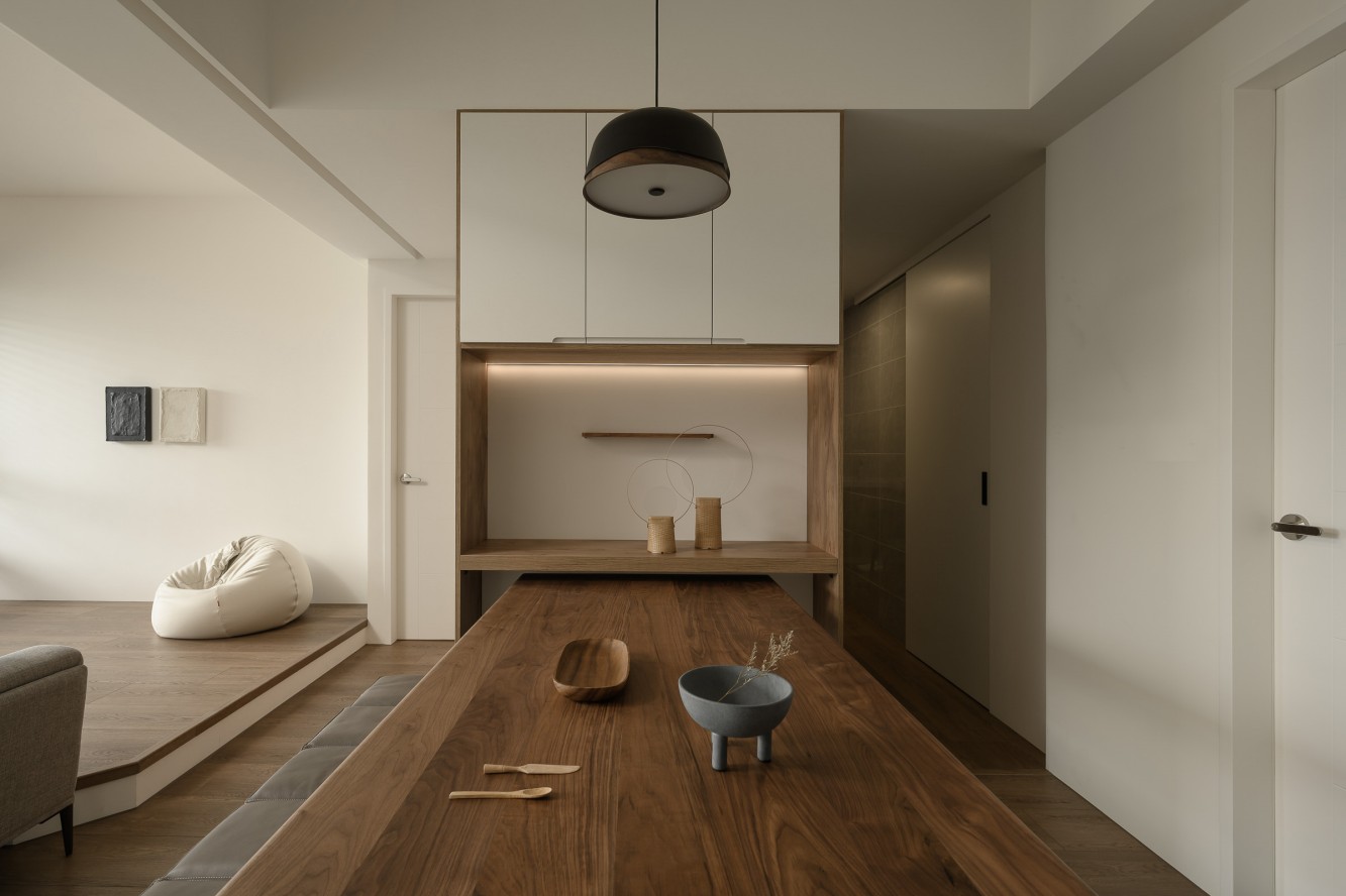 • 餐厨区:暖光把木色衬得更温柔,藏在柜体里的展示台像个小剧场,连摆件都裹着朦胧的光晕,夜晚亮起灯就是治愈的小世界。