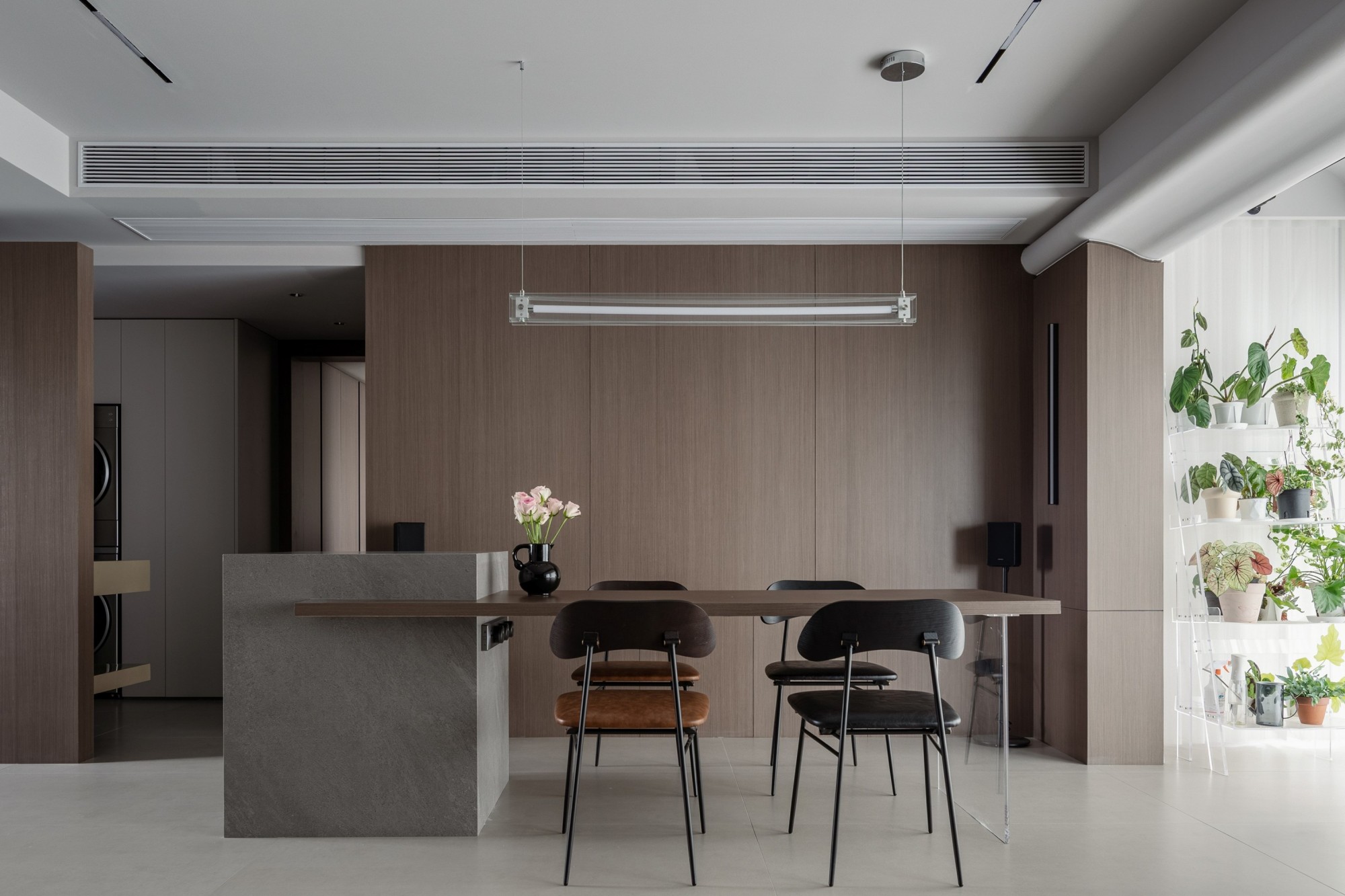 • 餐厅:木饰面墙+水泥质感岛台,自带沉静的侘寂氛围;透明吊灯+亚克力置物架,用“轻透感”让空间不沉闷,几株绿植是点睛的鲜活。