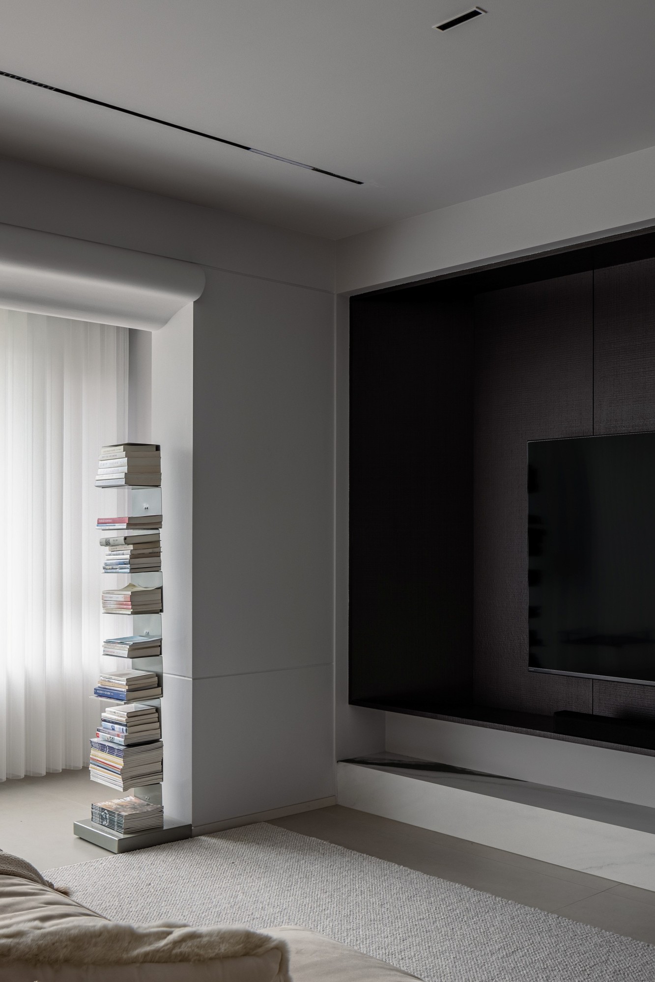 • 客厅:浅褐绒面沙发裹着柔软,黑色背景墙+悬浮电视柜衬出利落,玻璃书架叠着书籍,让极简多了份生活的温度;顶线暗藏灯带,柔化了空间的冷硬感。