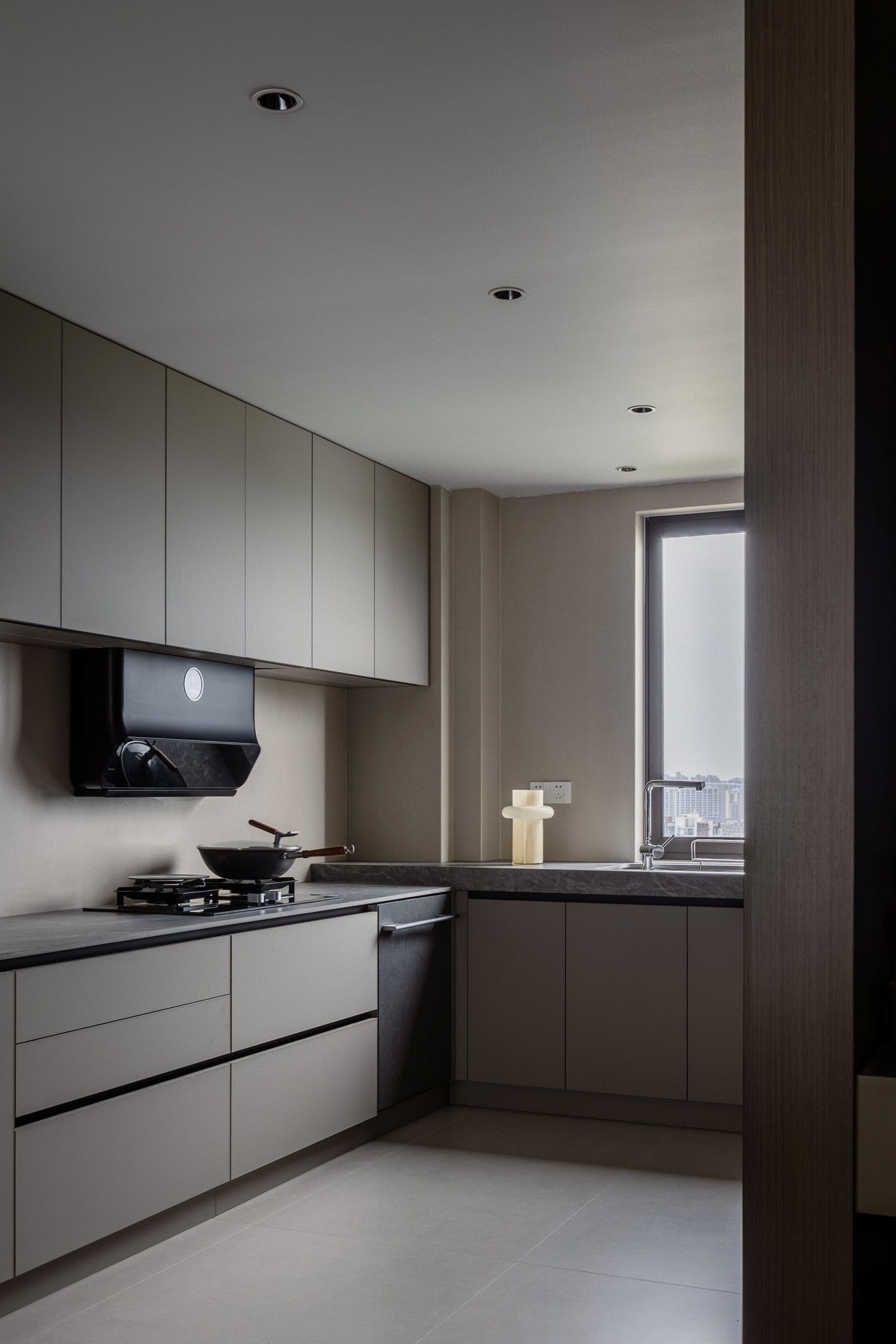• 厨房:浅灰橱柜+黑色烟机,极简线条里藏着实用,小窗透进的光,让下厨也成了放松的事。