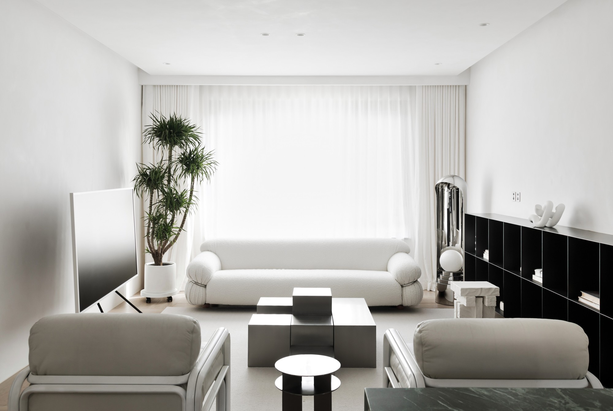 • 细节藏在“呼吸感”里:落地的龙血树带点热带松弛,银色艺术落地灯像流动的金属,和极简电视形成冷硬与柔和的对比。