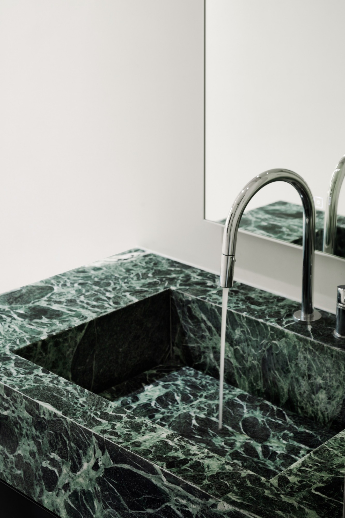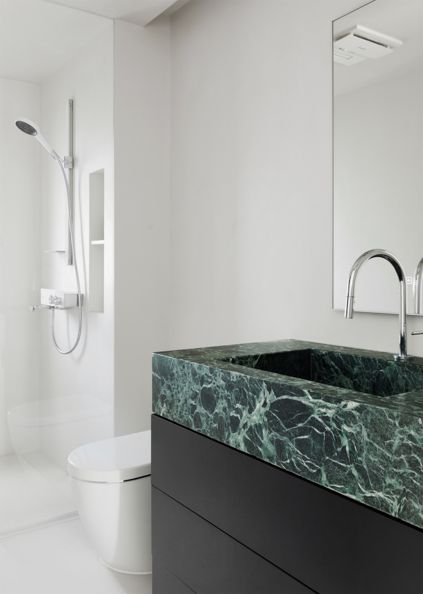 • 主调是纯白哑光墙面+地面,搭配黑色哑光浴室柜,台面同样用了祖母绿大理石(和洗手池一体化设计,无缝衔接更显高级);