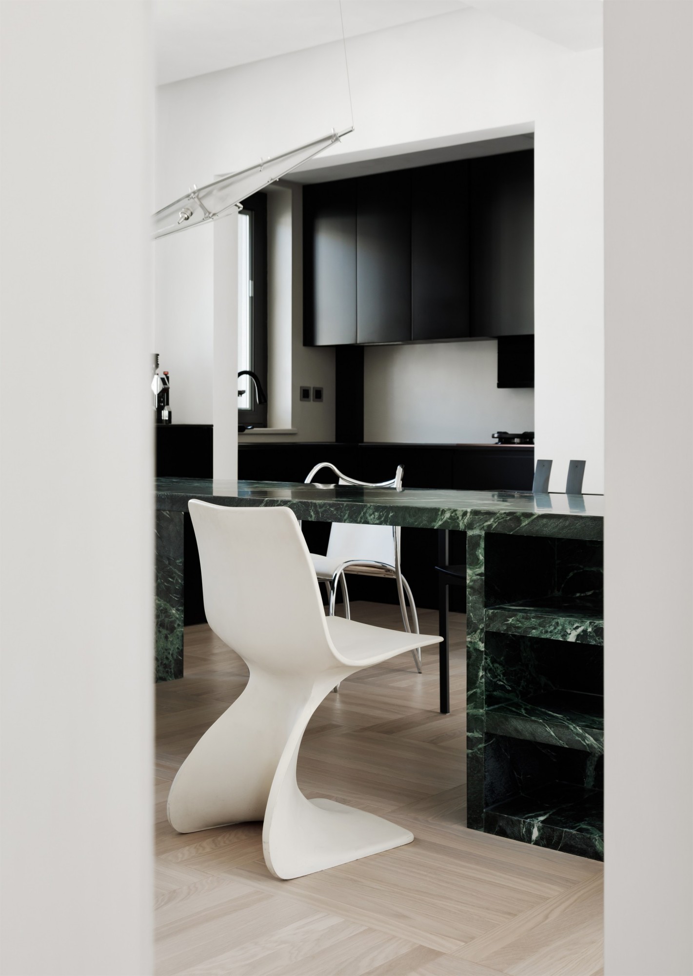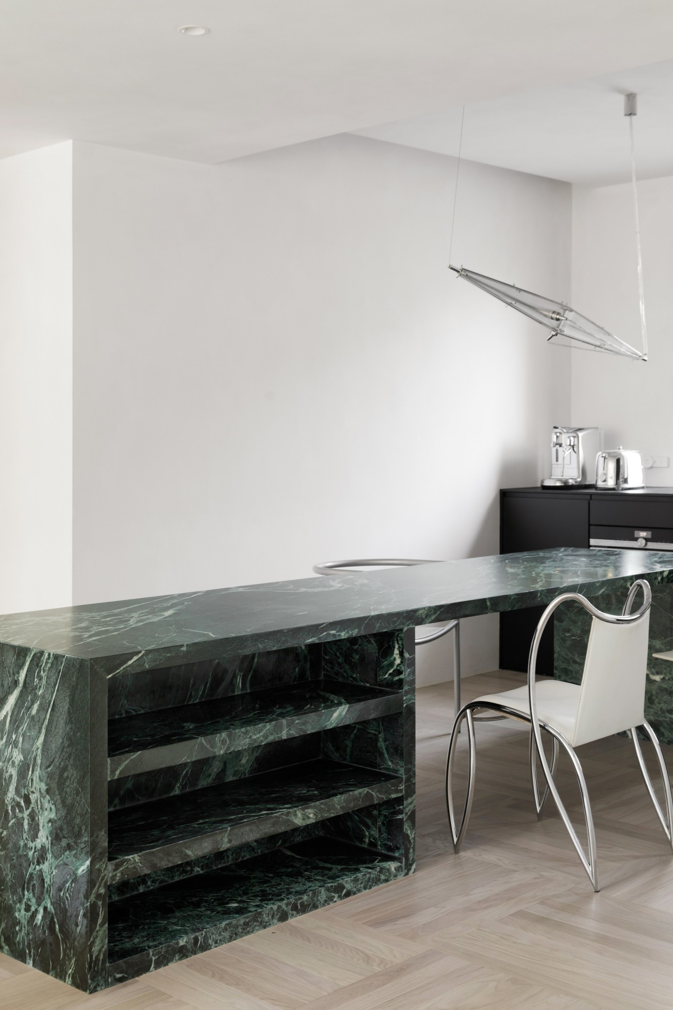 • 岛台/餐桌是核心:用一整块祖母绿大理石(深绿底色+白色纹理)做台面,下方挖空的层板延续石材纹理,既当餐桌又能储物;
