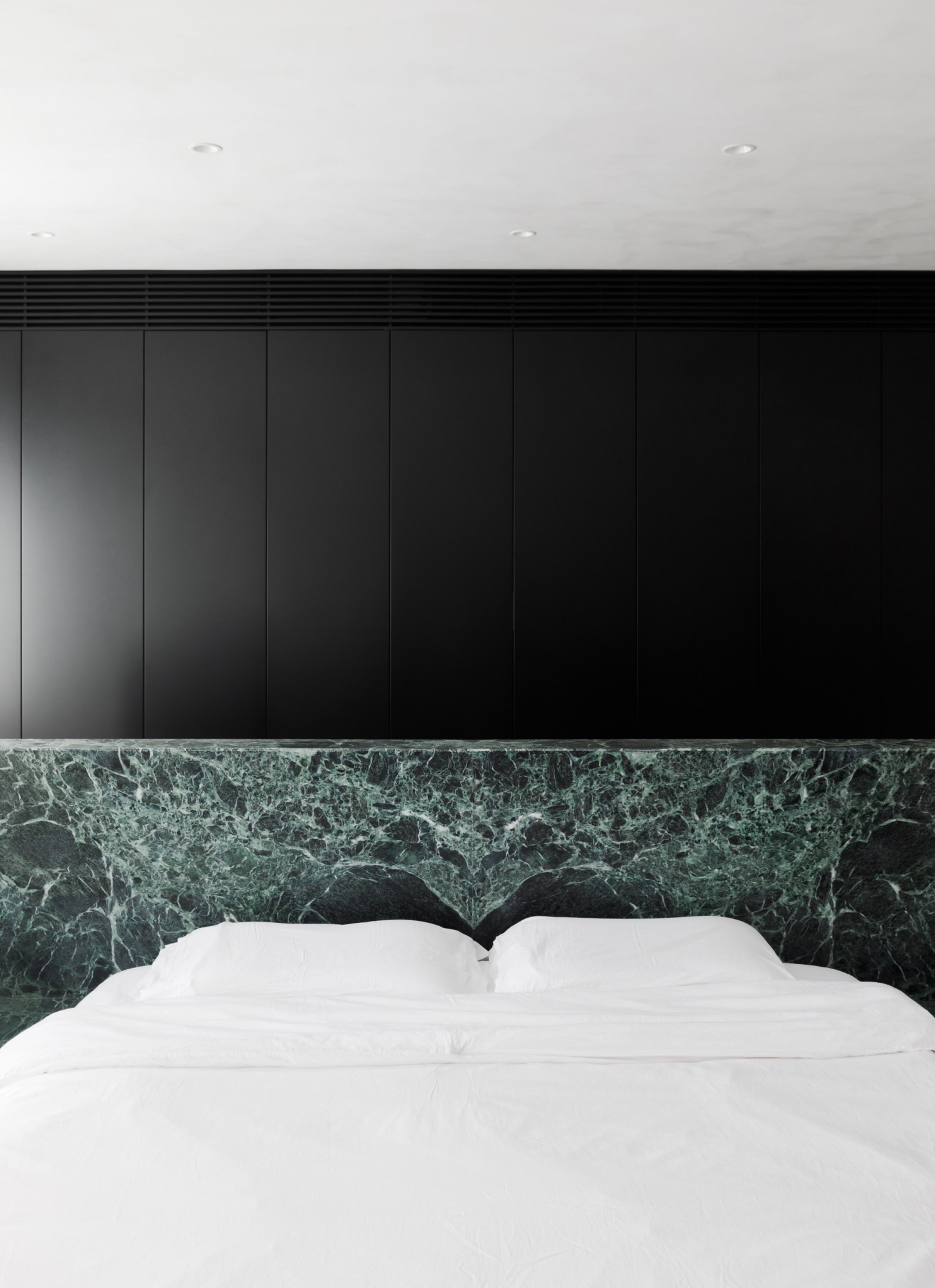 • 背景墙一半是黑色哑光护墙板(带隐形格栅,藏着通风细节),一半是祖母绿大理石床头,和客厅的奢石元素形成呼应;
