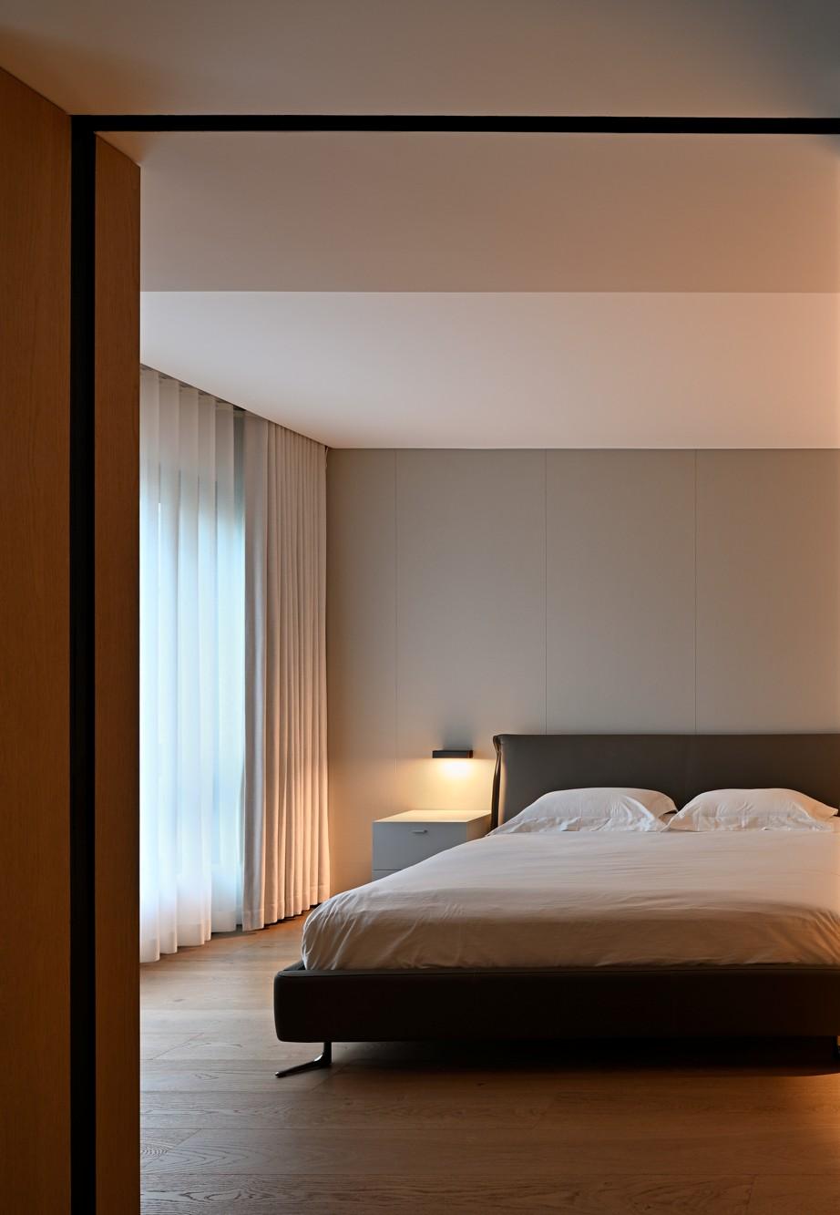 • 地面延续了客厅的浅橡木,光脚踩上去的温度,让卧室的松弛感更具体。