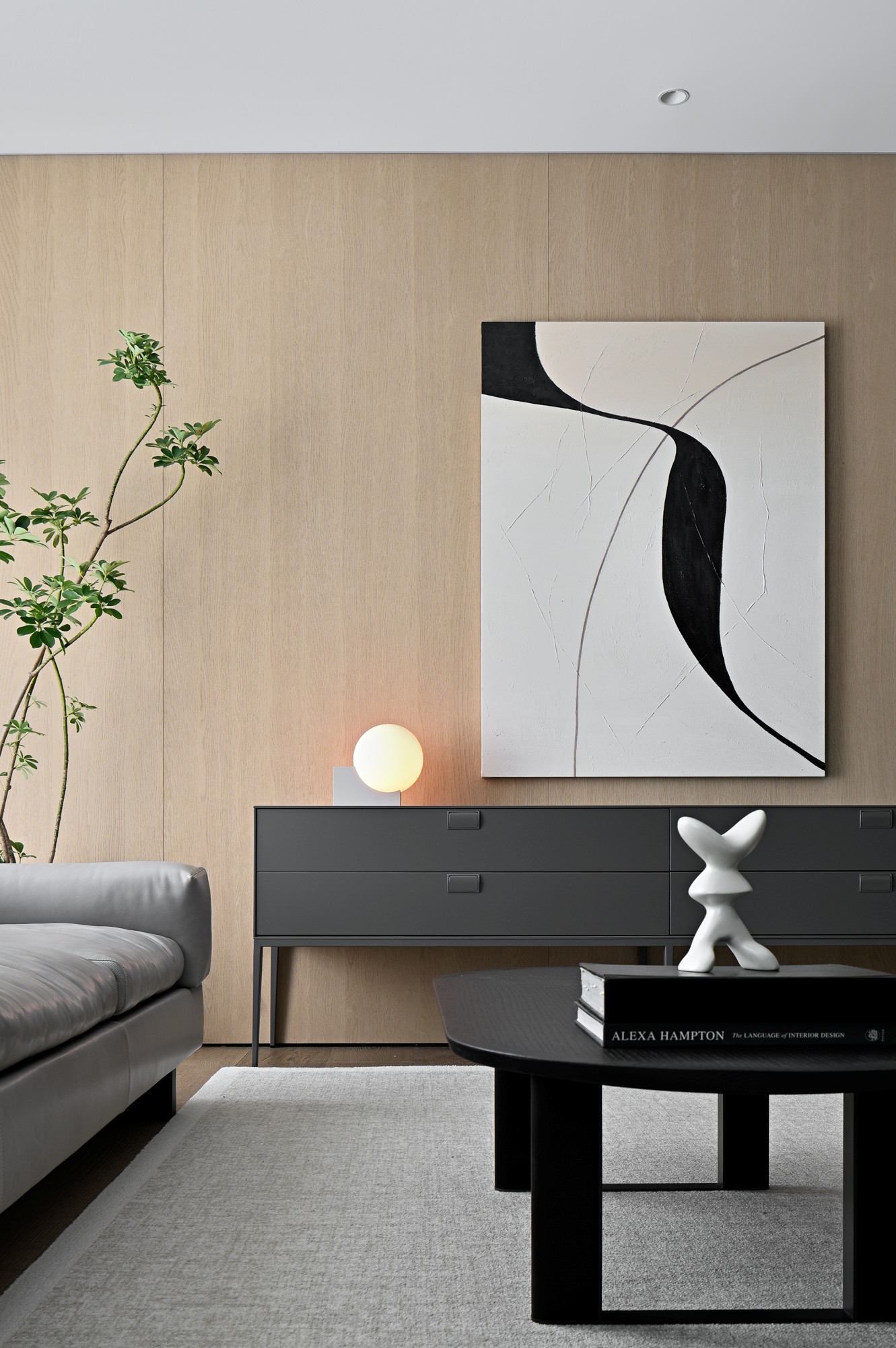 整个空间的妙处在于:用“暖木色”当温柔底色,用“黑灰冷调”做质感框架,再用“自然光线+艺术软装”当调味剂,既有极简的克制,又有生活的温度。