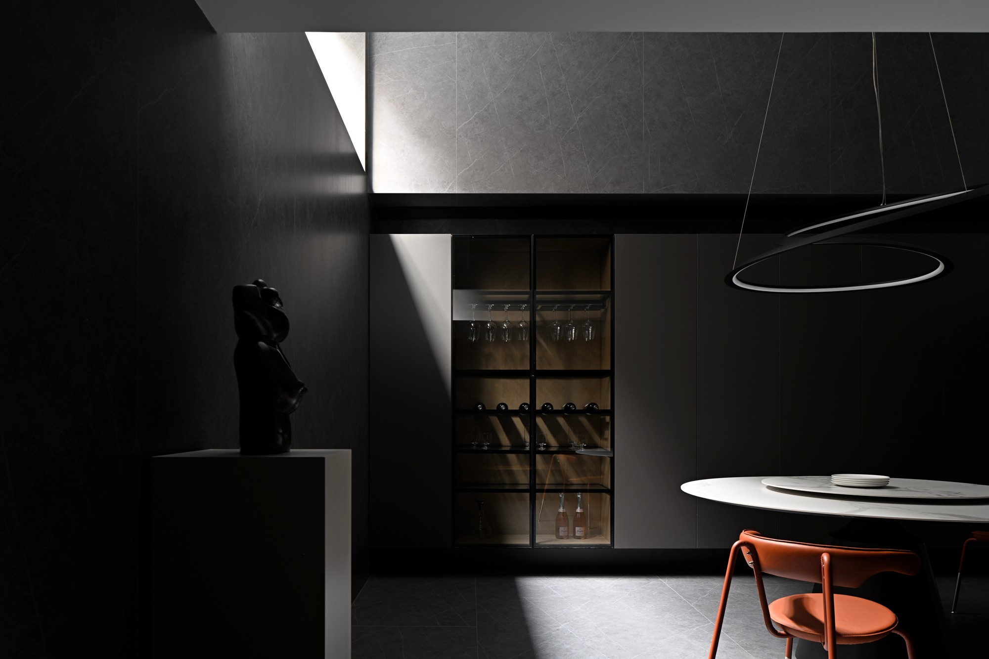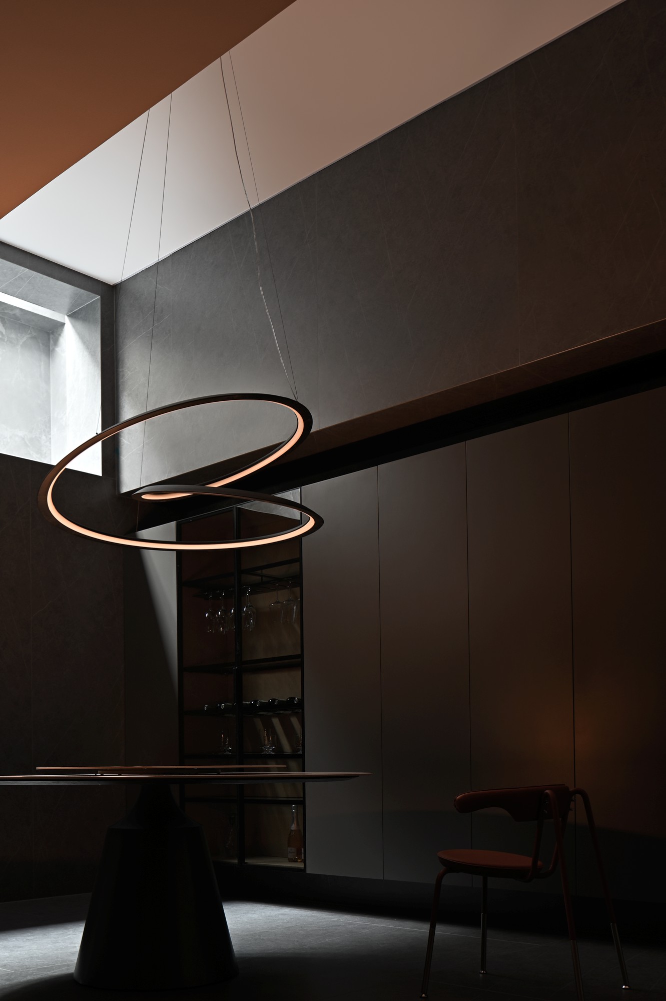 • 核心是大圆桌+悬浮式吊灯:圆桌选了“白台面+黑底座”,中和了暗调的厚重;吊灯是双环曲线造型,悬浮在空中像个艺术装置,把冷调空间衬得很灵动;