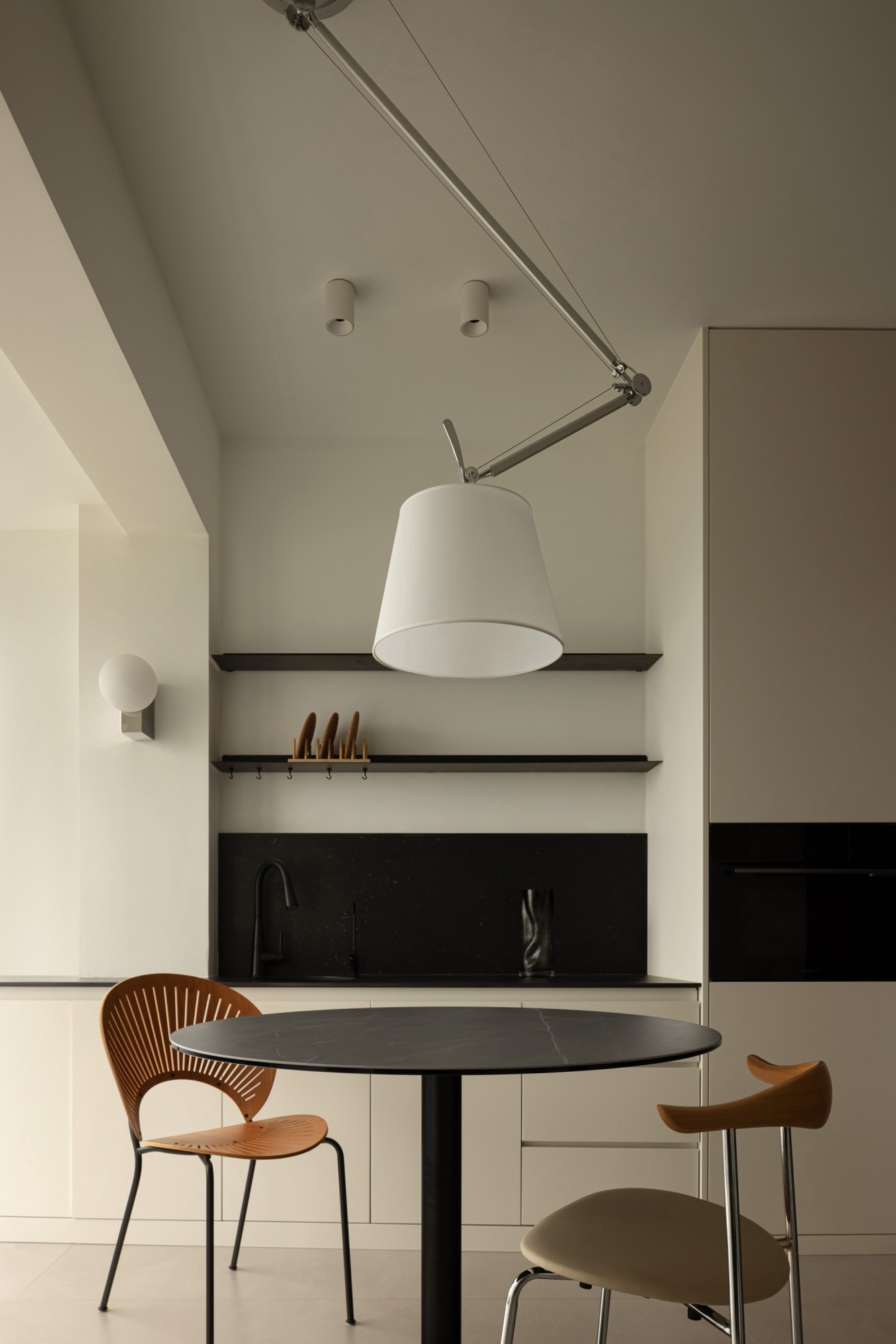 • 空间是“白墙+黑柜”的干净框架,却靠木色餐椅添了温柔;