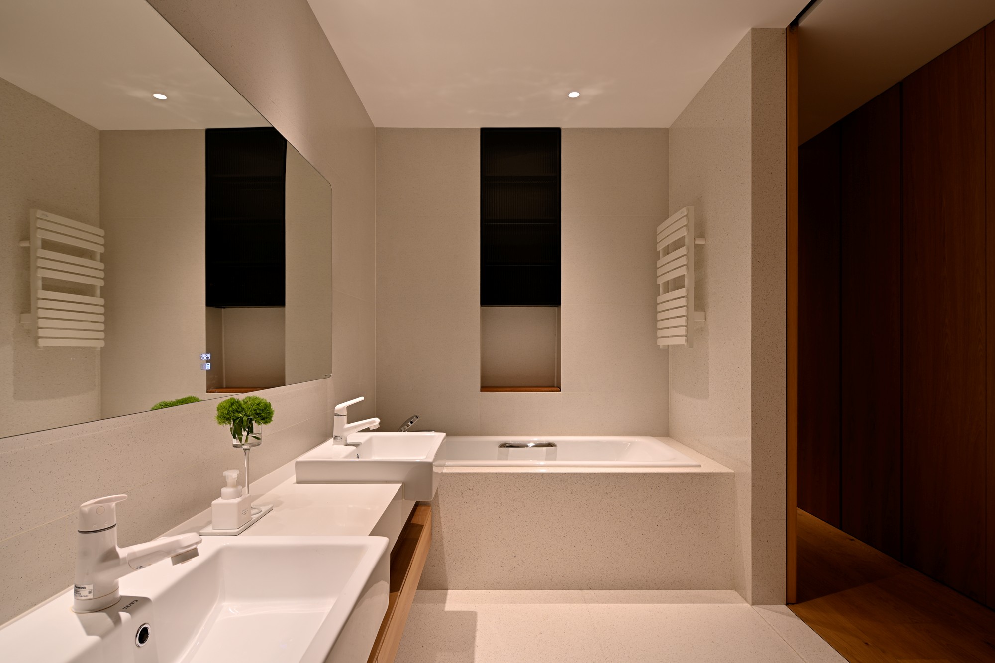 • 主调是浅米水磨石+原木柜,像把“自然肌理”搬进了浴室;