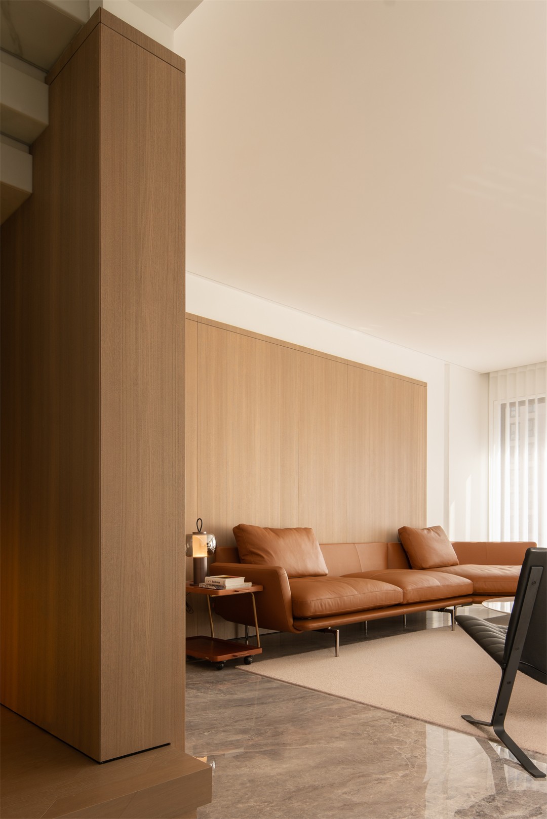 浅木纹理包裹墙面,消解了空间的冷硬;焦糖棕皮质沙发带着慵懒的松弛感,却以利落的线条守住极简调性;黑色单椅的几何骨架、玻璃圆桌的轻盈,让柔和里多了几分“刚”的精致。百叶帘滤过的光线铺在地面,连阴影都成了温柔的装饰。