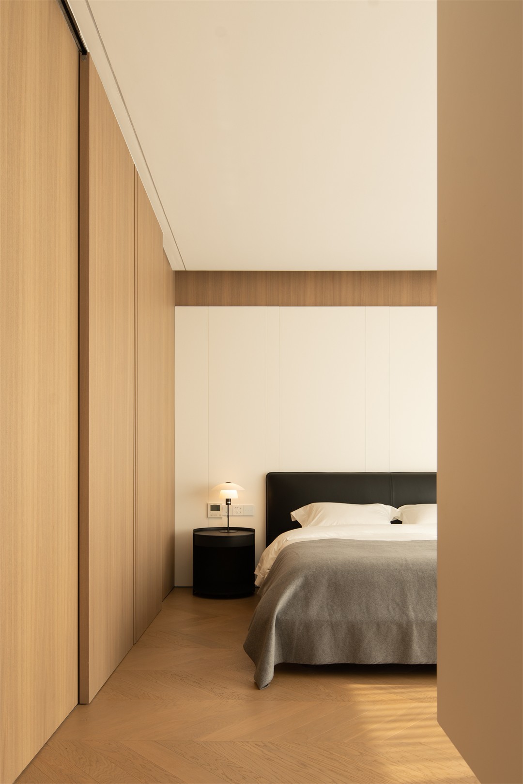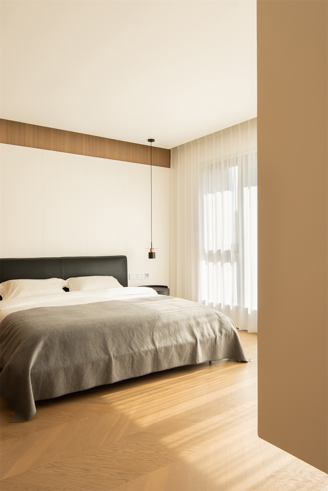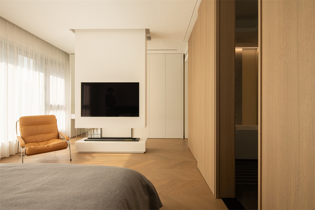 人字拼木地板暖了脚感,木色移门轻推便衔接卫浴,把“通透感”拉满;床品的灰与白是安静的底色,阳光斜切在床沿,连时间都慢了下来——松弛,是这里最直观的体感。