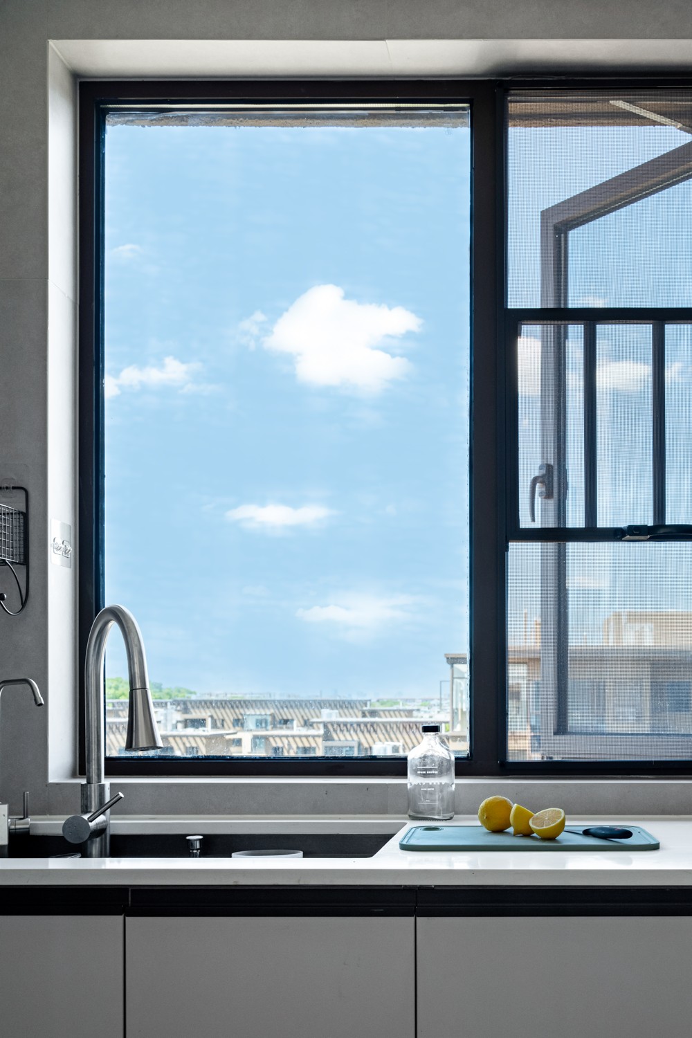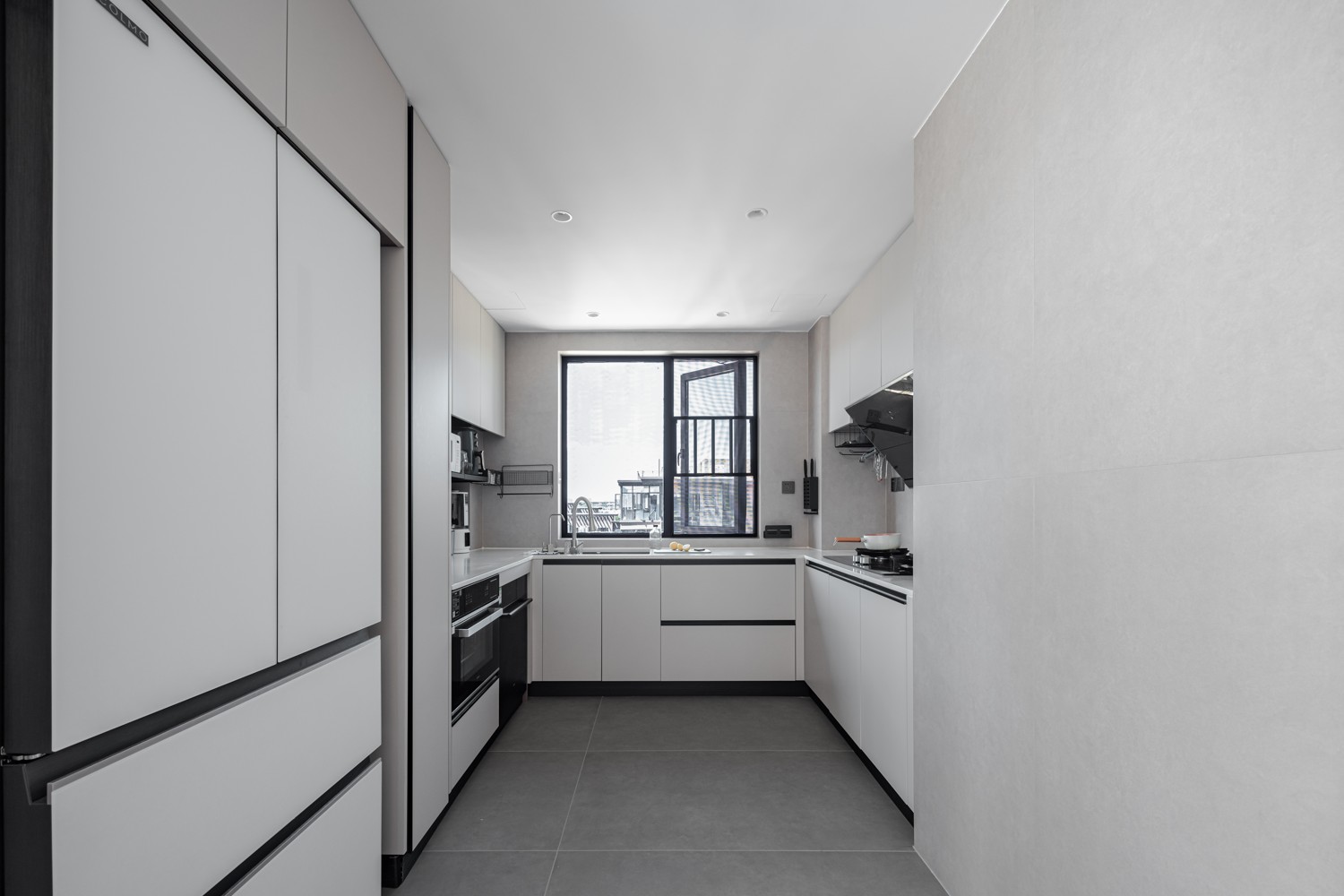 纯白柜体与深灰台面撞出“冷静的烟火气”,嵌入式厨电把琐碎藏进墙里,U型台面让备菜、烹饪、盛盘动线像“自动巡航”。黑框窄窗把窗外的光裁成条,落在干净的台面上,连锅铲碰撞声都变得轻快。
