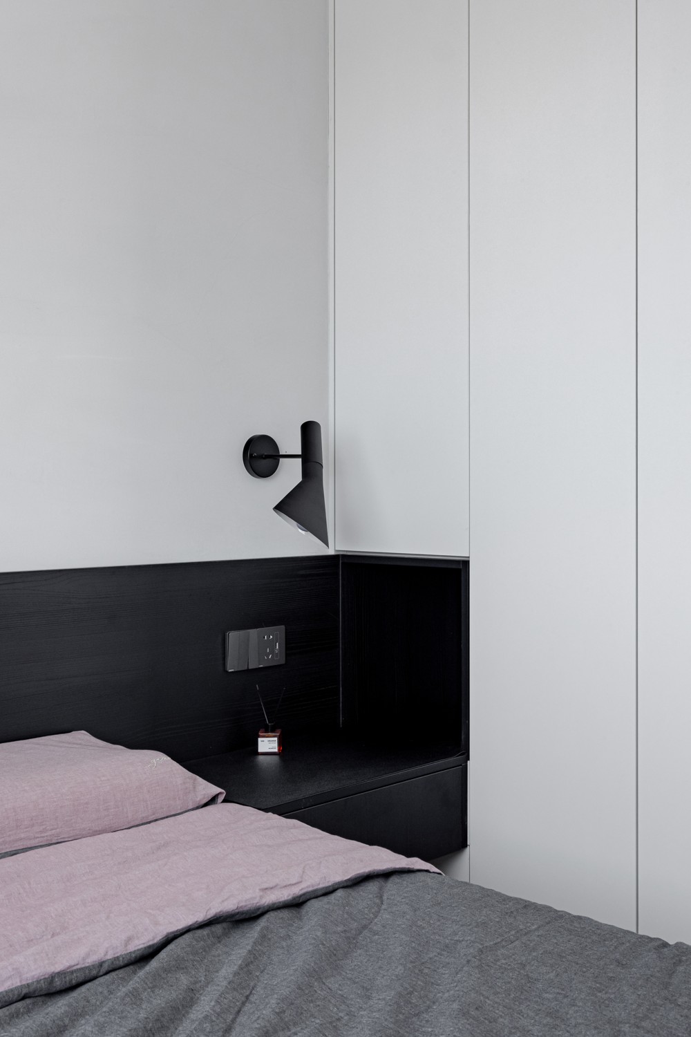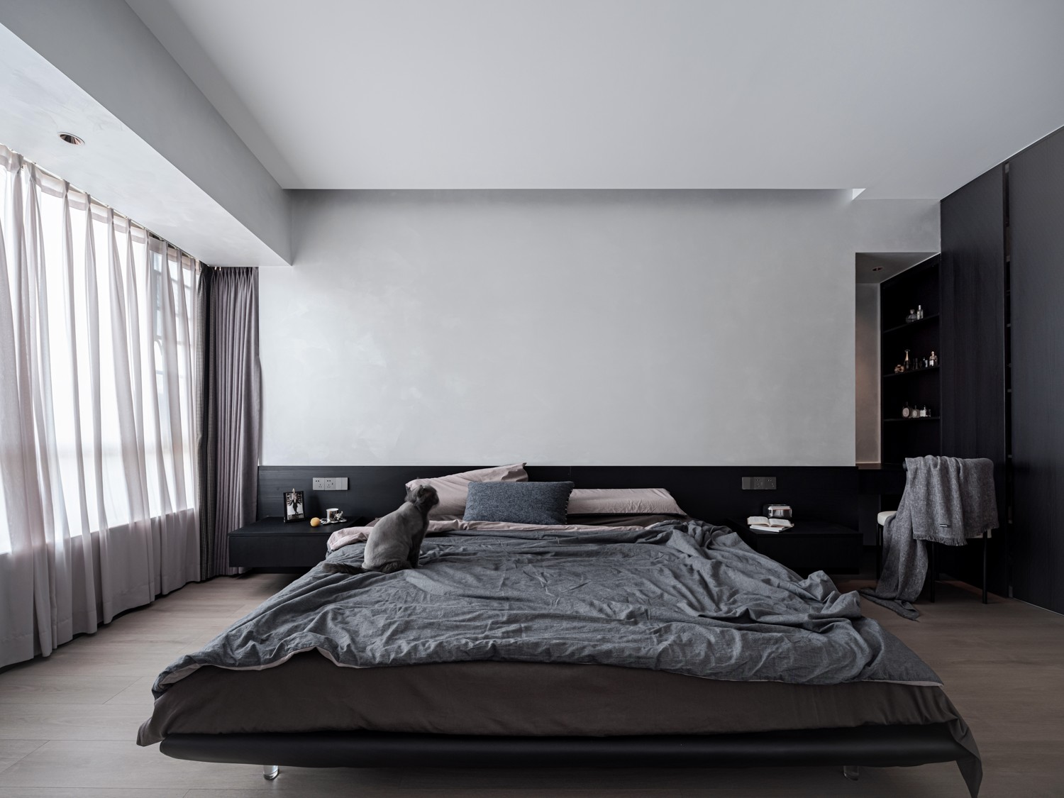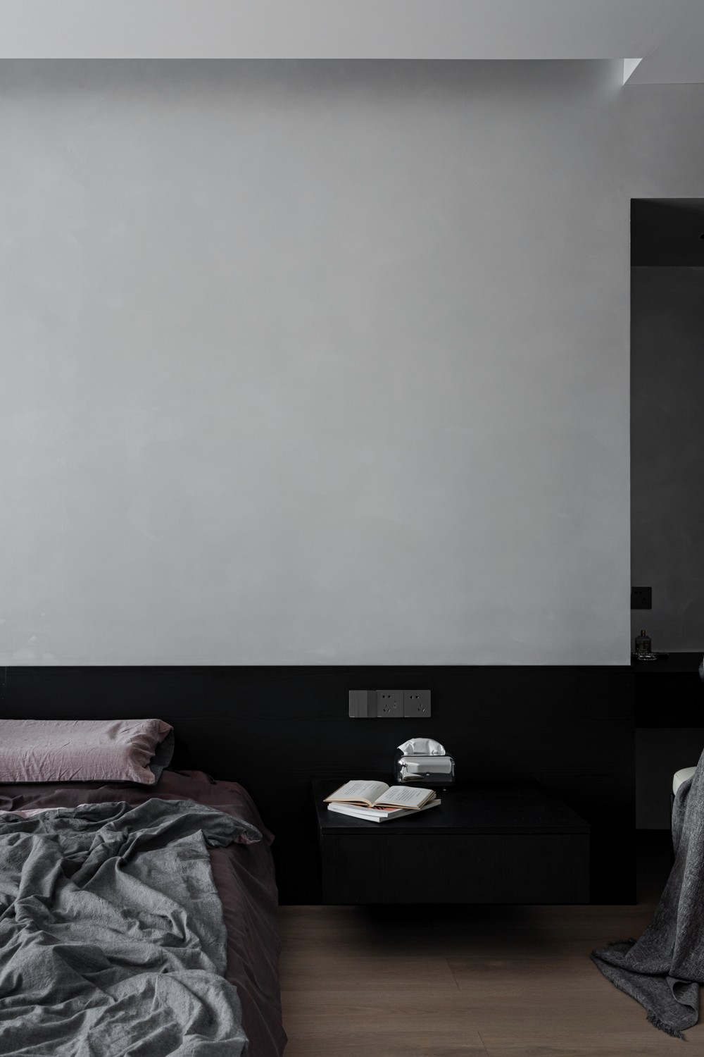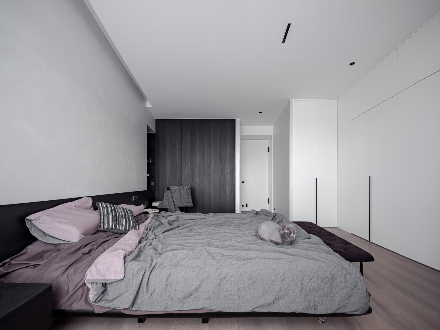 浅灰艺术漆墙面像“被揉过的云”,悬浮式黑床头板是视觉锚点,床品选了同色系的软糯面料——连毛孩子都爱蜷在上面打盹。隐形门后藏着开放式置物架,深夜小酌的酒杯、香薰,都有了妥帖的归处。