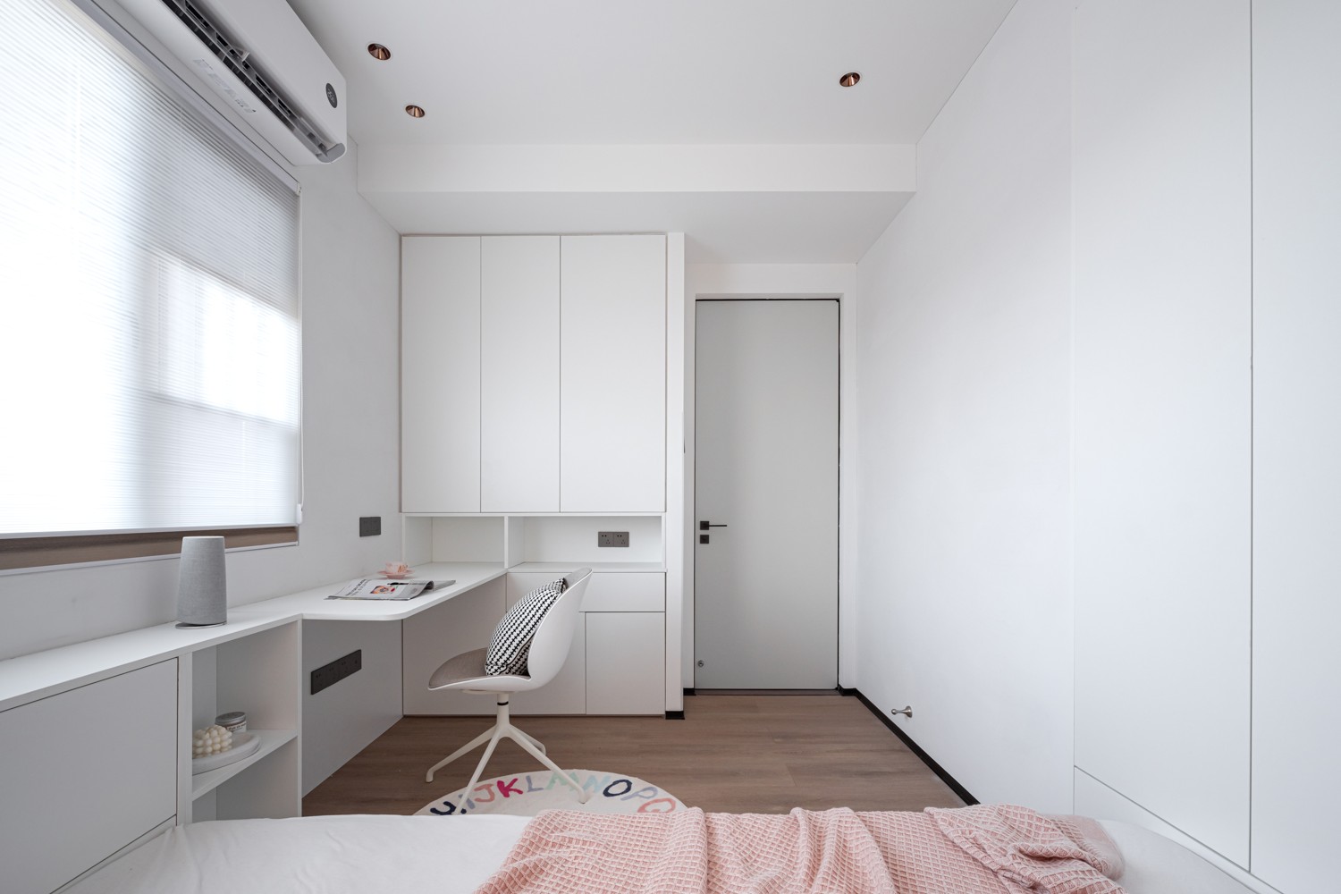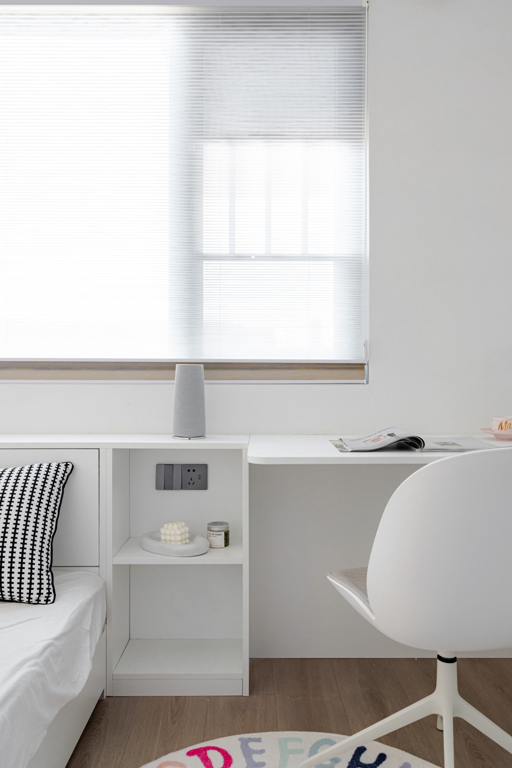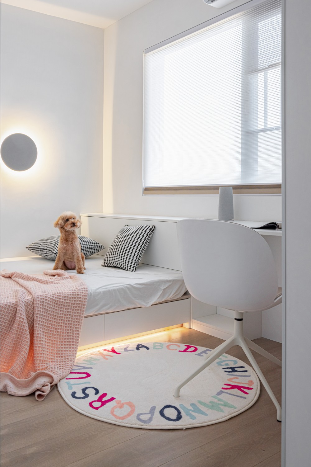 榻榻米+书桌的一体化设计,是“次卧/书房/毛孩子乐园”的三重奏:白天是办公区,铺开电脑就能敲字;晚上铺上粉毯,秒变客卧;连角落的字母地毯,都是宠物的专属“撒欢地”。圆镜壁灯暖光一落,小空间也裹着温柔。