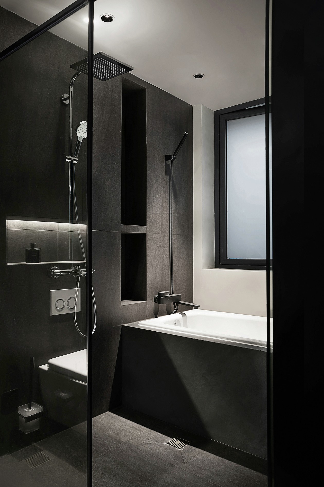 深灰石纹墙是“低调的背景板”,壁龛里的香薰是暗调里的精致,悬浮马桶扫光卫生死角,玻璃淋浴间把水汽锁在里面——连洗漱都成了“不慌不忙的仪式感”。