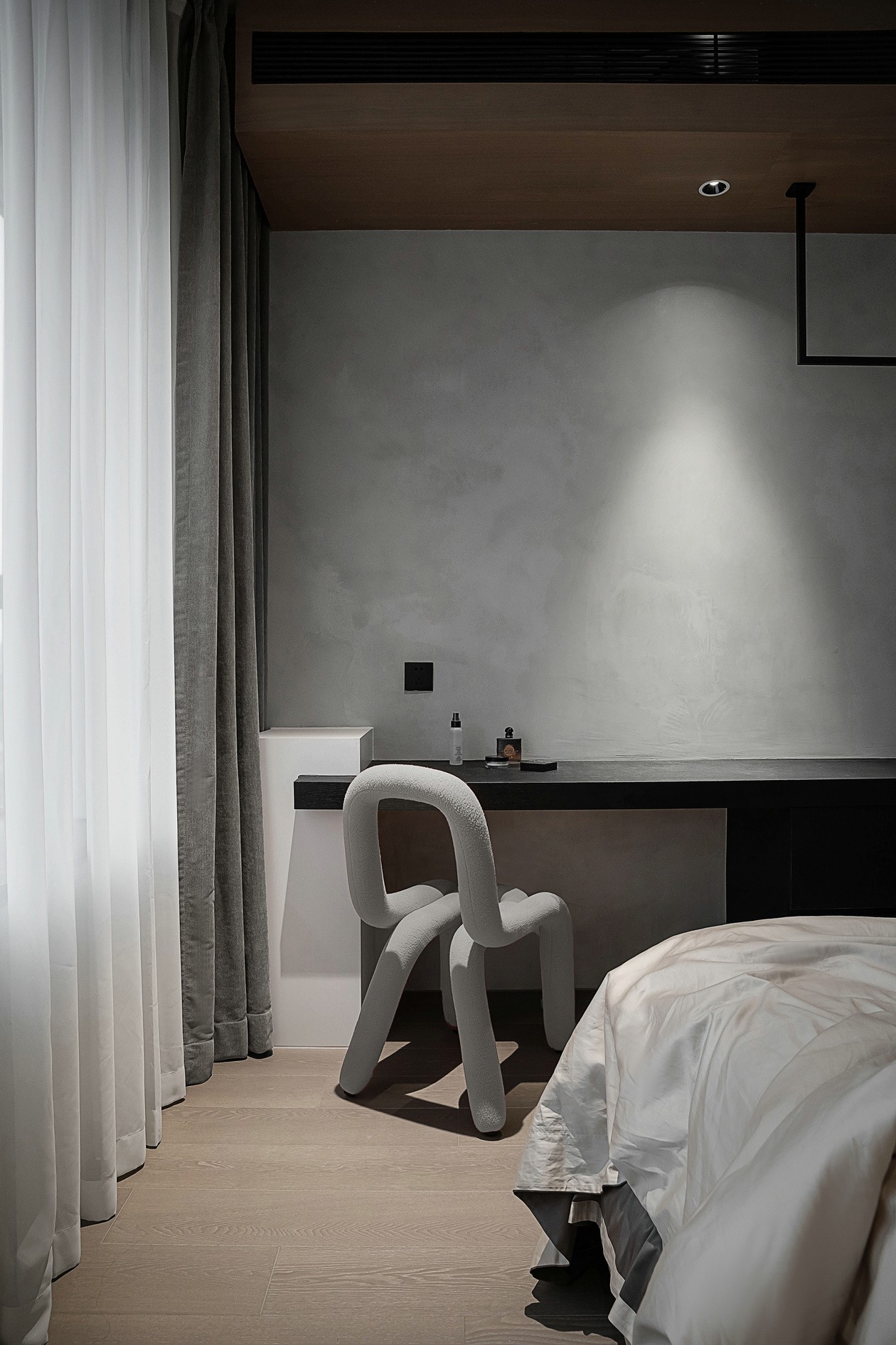 浅米床品像“刚晒过的云朵”,靠在木饰面床头板上,连呼吸都软下来。墙侧的悬浮长桌,既是梳妆台也是书桌,挂衣杆随手搭件毛衣,冷调空间里多了“有人住的温度”。纱帘滤过的光,把整个房间裹成“只属于自己的松弛胶囊”。