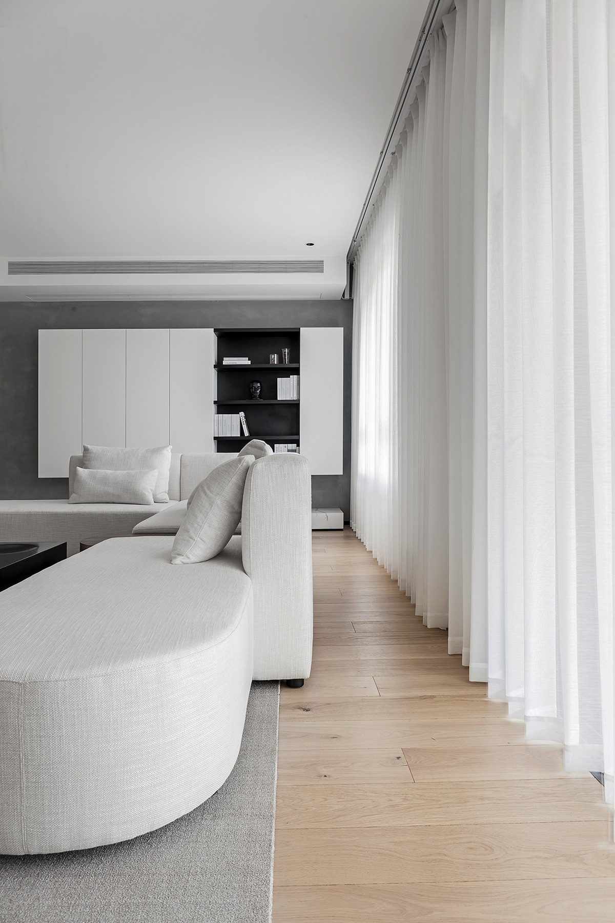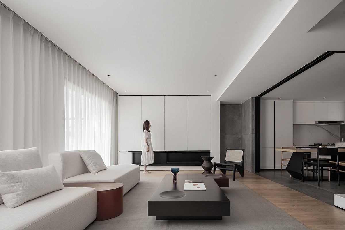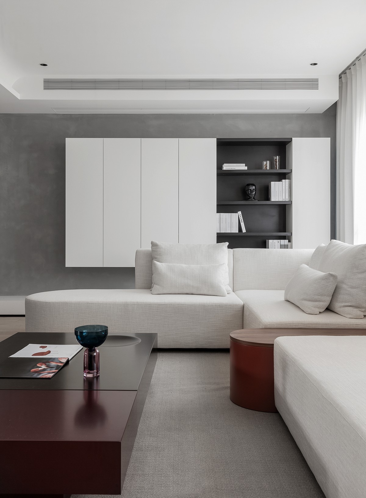 通顶柜藏起杂物,局部开放格架摆上书籍小物,纱帘滤过的柔光漫进来,连空气都跟着轻了。