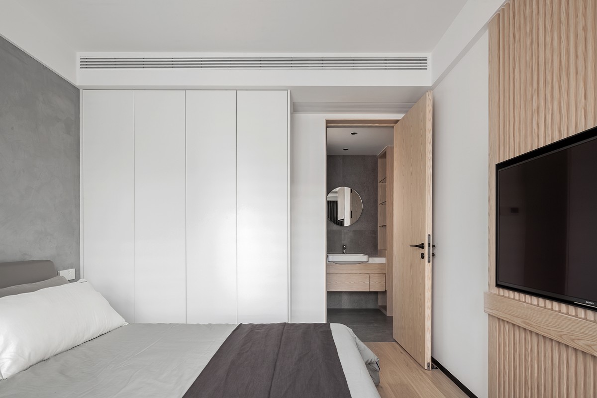灰调墙面+木饰面的搭配,连灯光都调成了漫反射,推开浴室门,灰砖与原木柜的组合,连洗漱都裹着松弛感。
