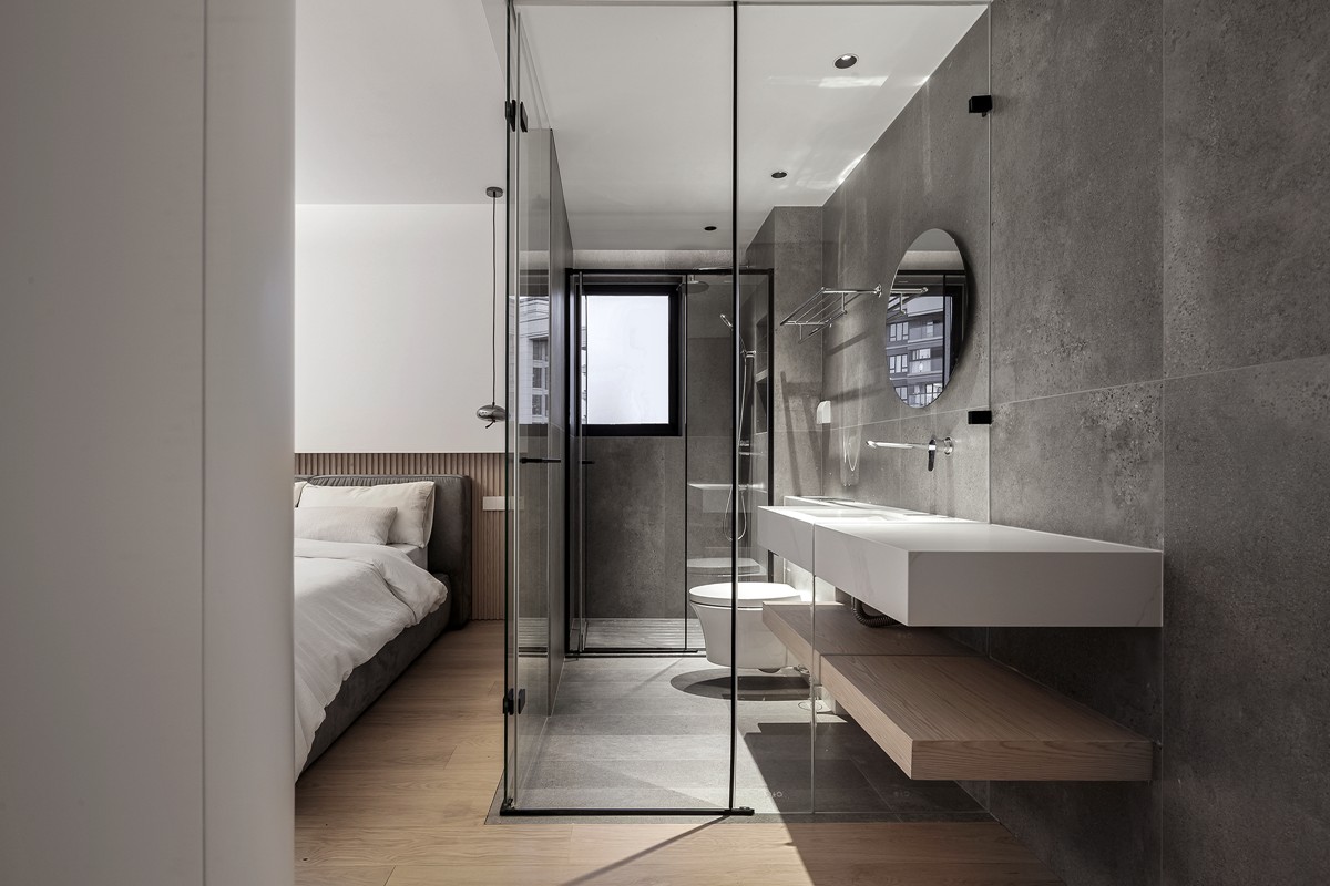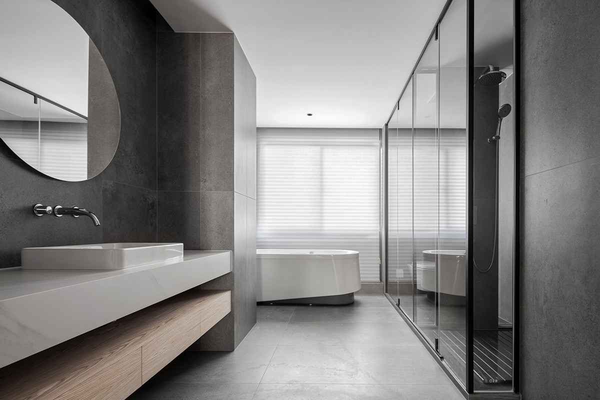 灰白瓷砖里嵌着原木柜,圆形镜和独立浴缸的搭配,把“功能性”做成了“氛围感”——泡澡时,百叶窗滤过的光漫进来,连独处都成了享受。