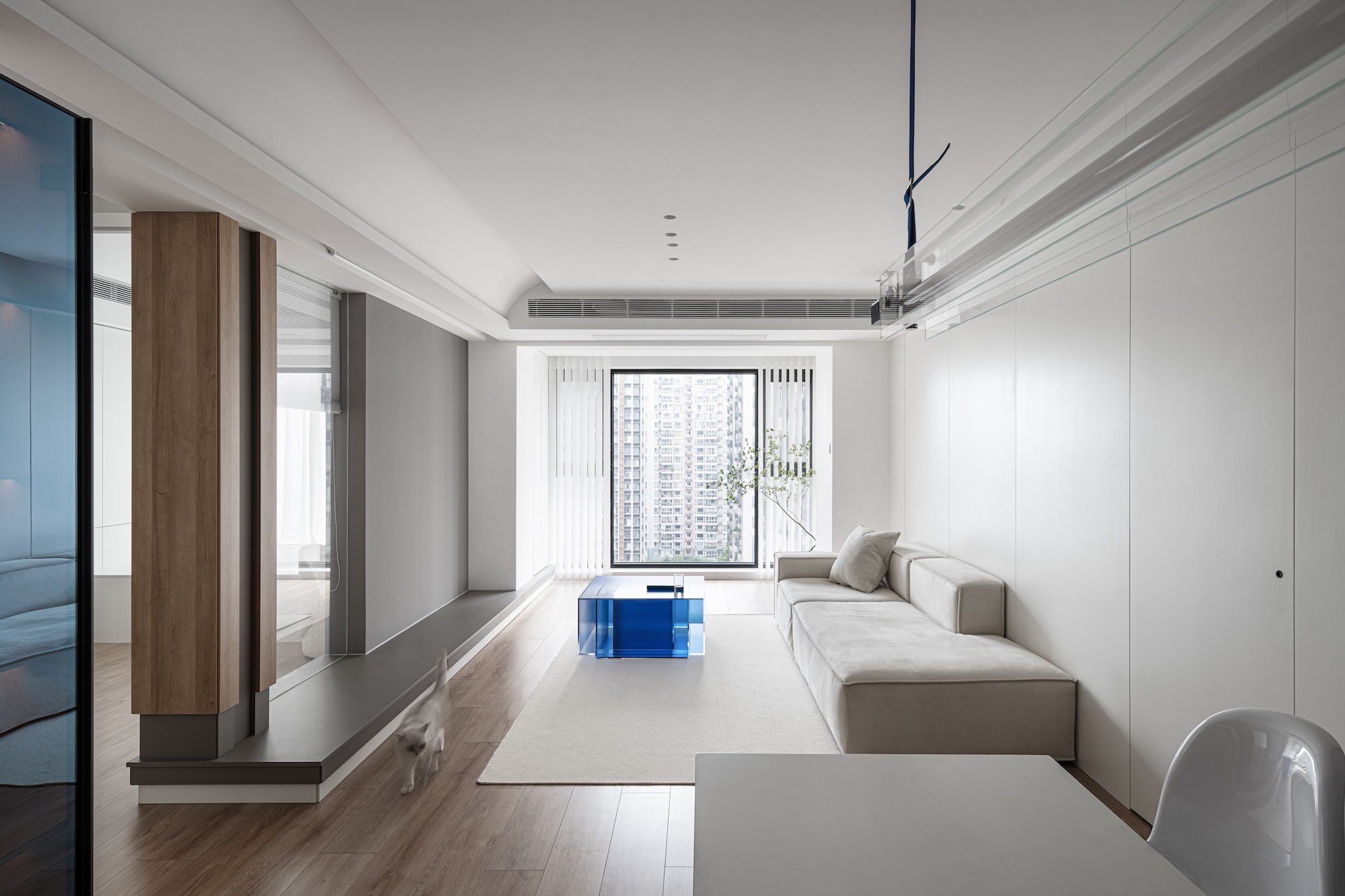 这是一套140㎡“冷调极简+通透质感”的现代住宅,用「白+灰+玻璃蓝」的克制配色,把“通透”与“秩序”揉进每处空间,像把城市里的冷静松弛感搬进了家。
