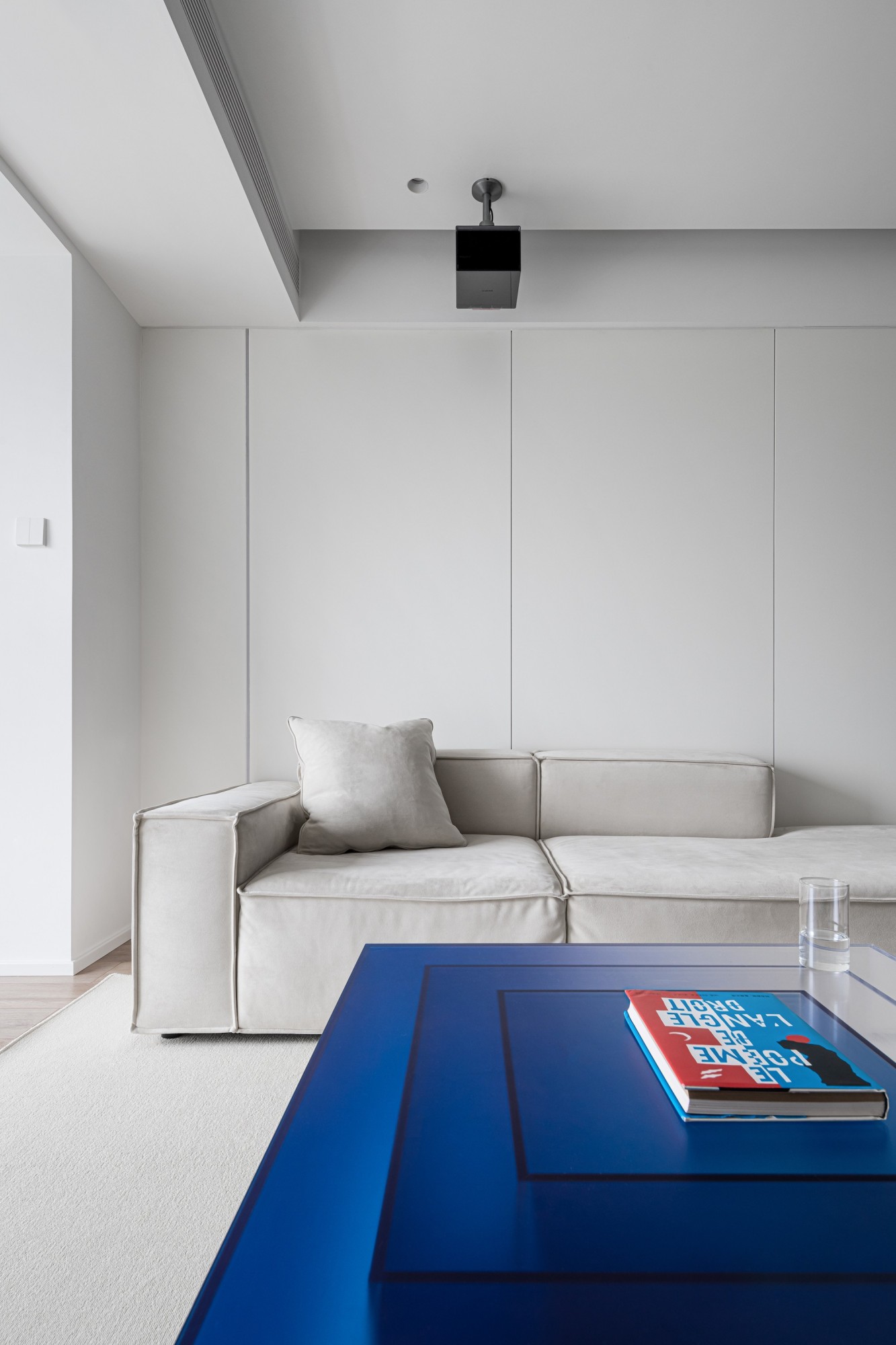 奶油色矮沙发贴墙而放,留出通透动线;克莱因蓝亚克力茶几是点睛之笔——冷调玻璃的轻盈感,让空间瞬间跳出沉闷,连光影都跟着灵动起来。