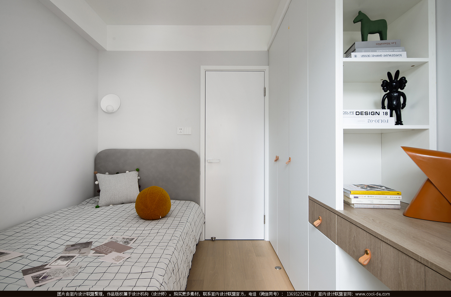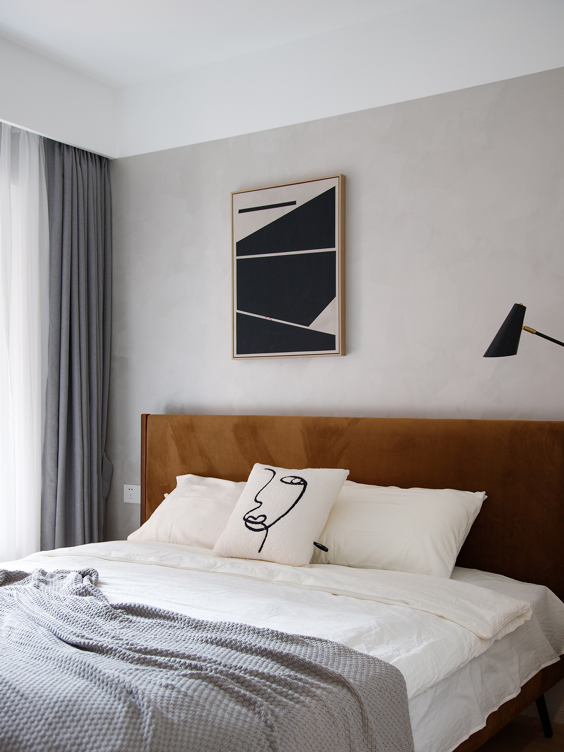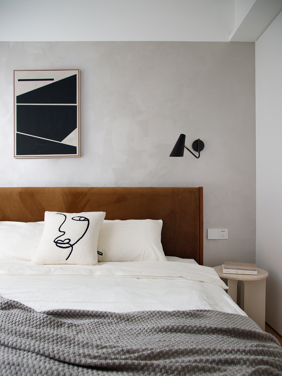 焦糖棕软包床头像块融化的太妃糖,线条抱枕是黑白调的“小俏皮”,针织毯搭在床尾,连灯光都温温柔柔的。