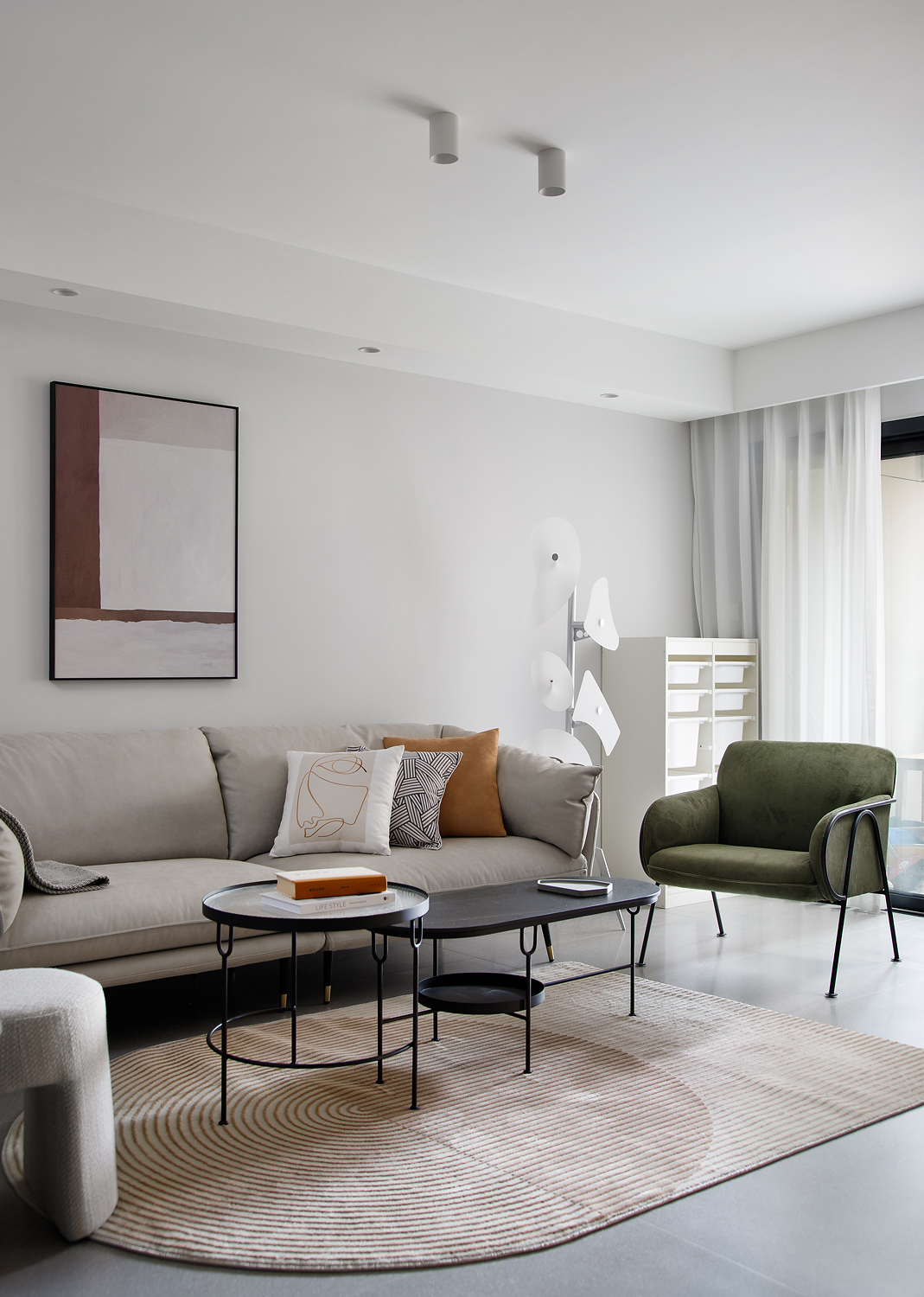 奶杏色沙发像块被晒软的棉花,橄榄绿单人椅是角落里的“小惊喜”,波浪纹地毯踩着像踩在云朵边。