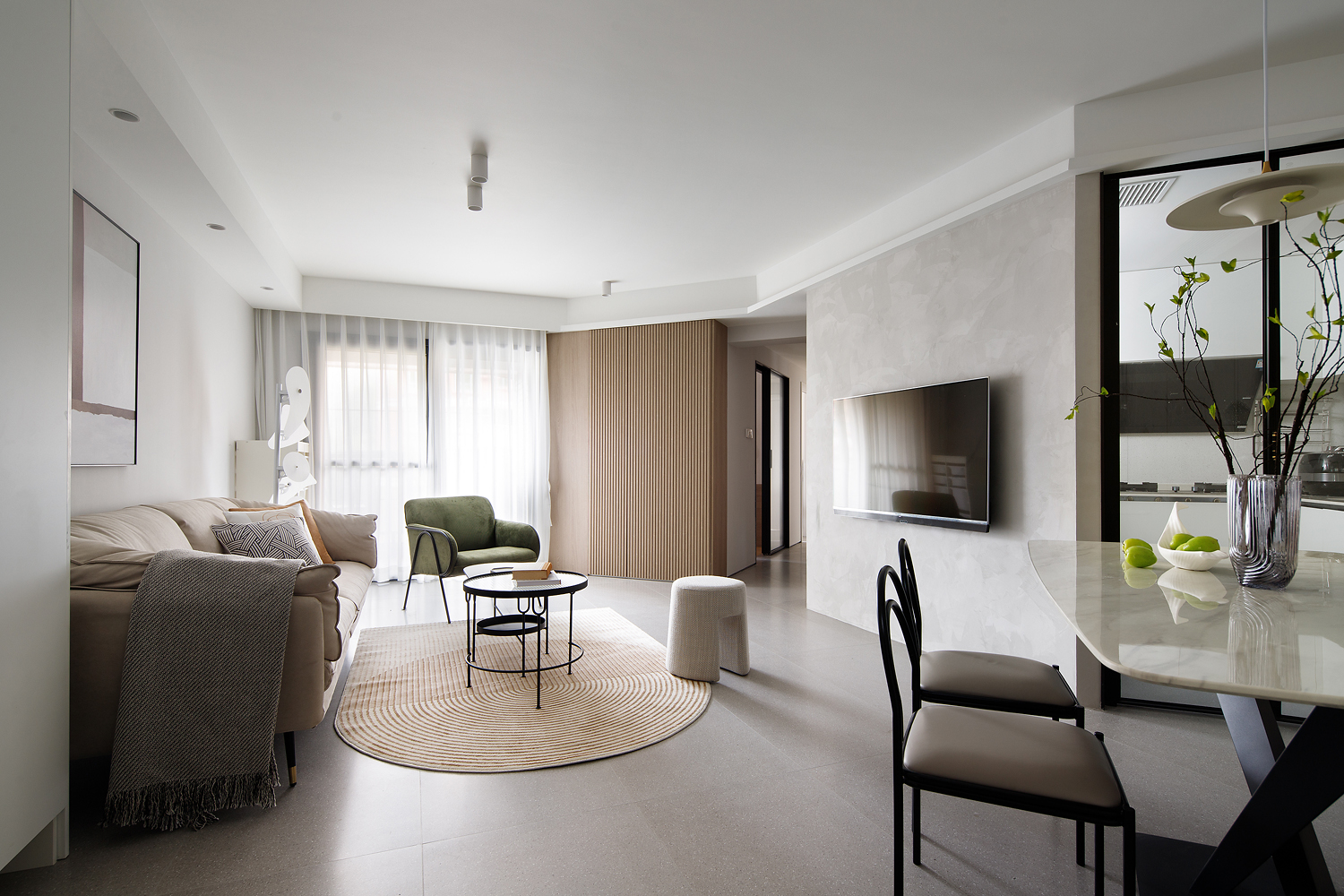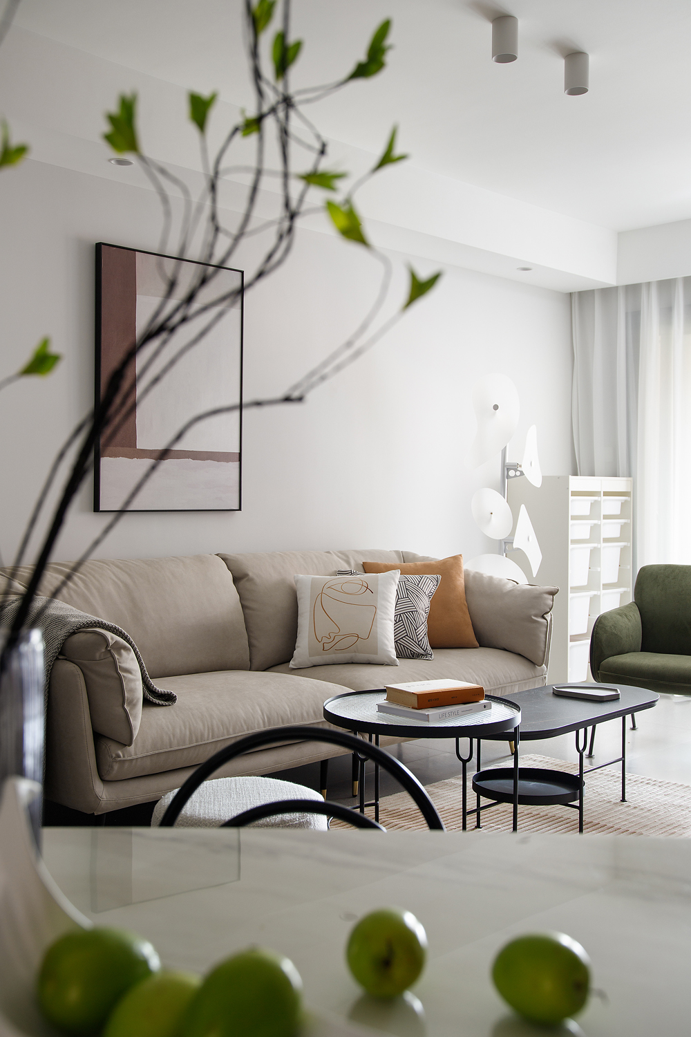 这个家没有“用力的精致”,只有“刚刚好的温柔”:是光脚踩在暖调地砖上的温度,是陷进沙发时的包裹感,是极简里藏着的、触手可及的松弛。