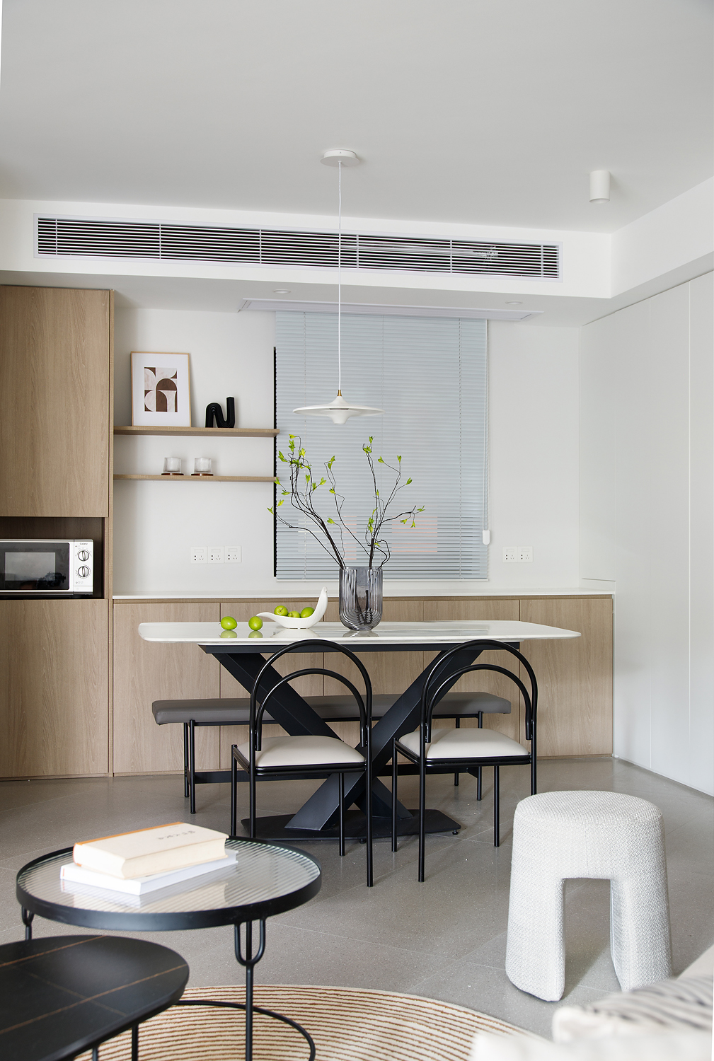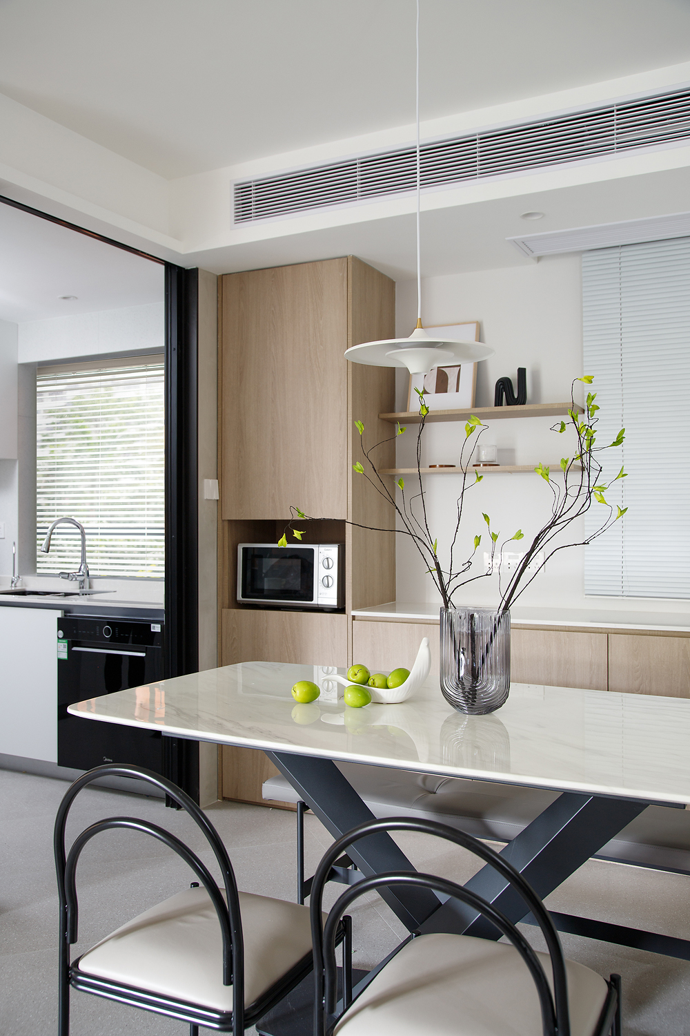 浅木色橱柜裹着暖调,白色岩板餐桌干净得像块奶糖,黑色金属椅腿是冷调里的“小利落”。