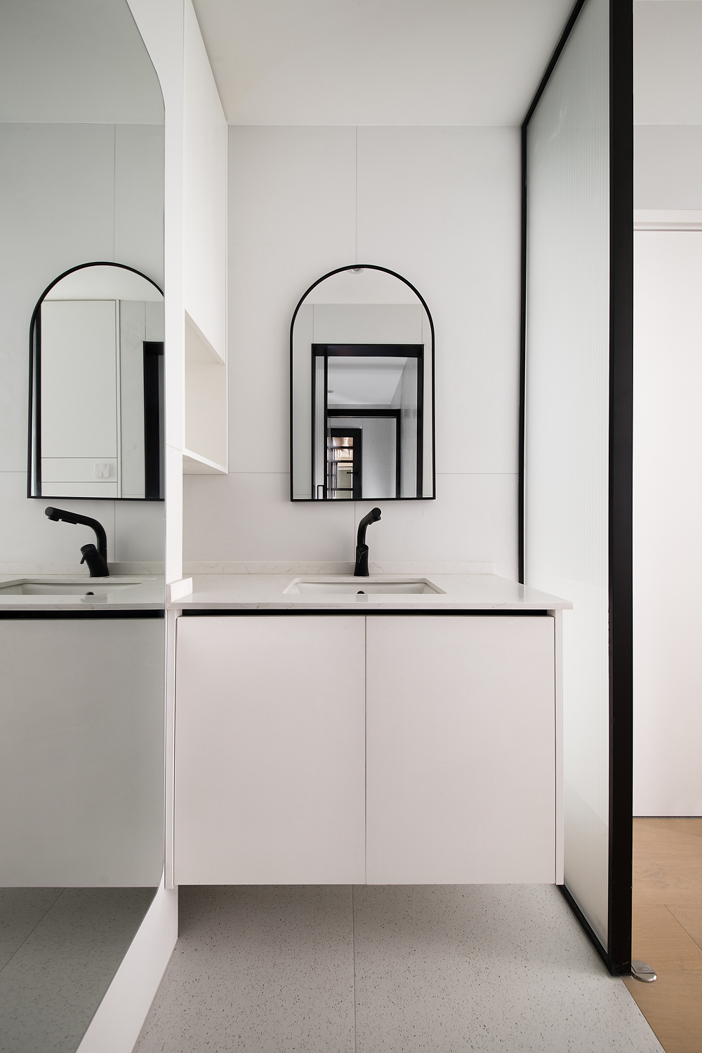 白色台盆+黑色金属边,像块刚切好的“黑白巧克力”,拱形镜的曲线是冷调里的“小温柔”。
