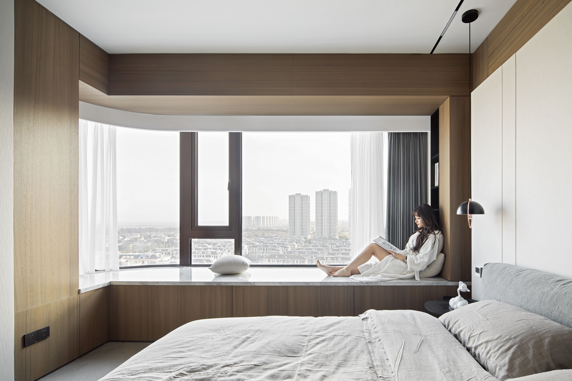 圆弧飘窗把城市景色框成画,木饰面裹着的地台能赤脚踩上去,连灯光都选了“不刺眼的温柔款”。在这里窝着看书,窗外是高楼,怀里是松弛,家的意义就是“把奔波都关在门外”。