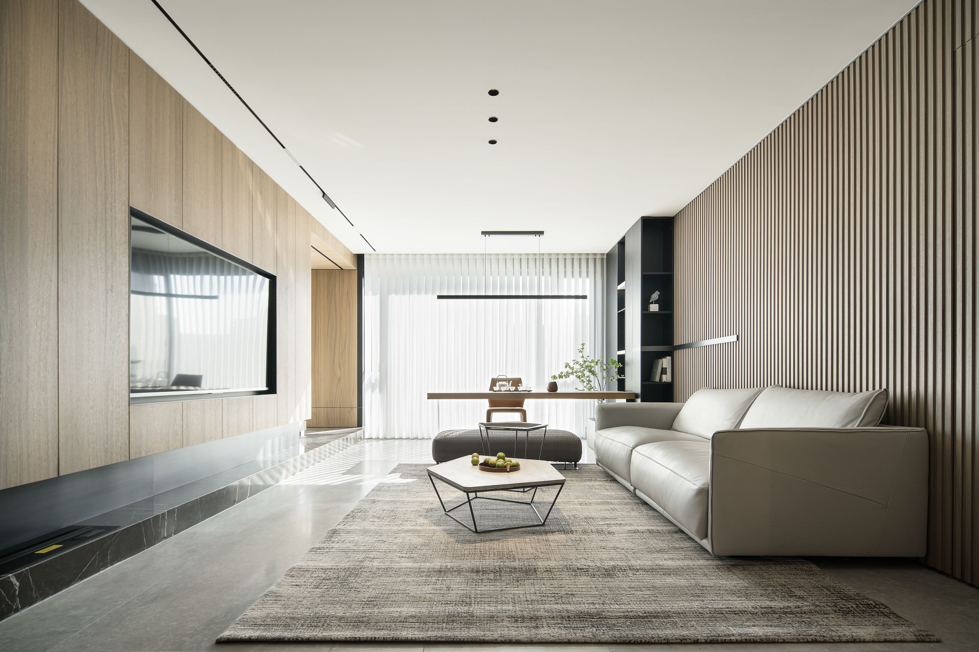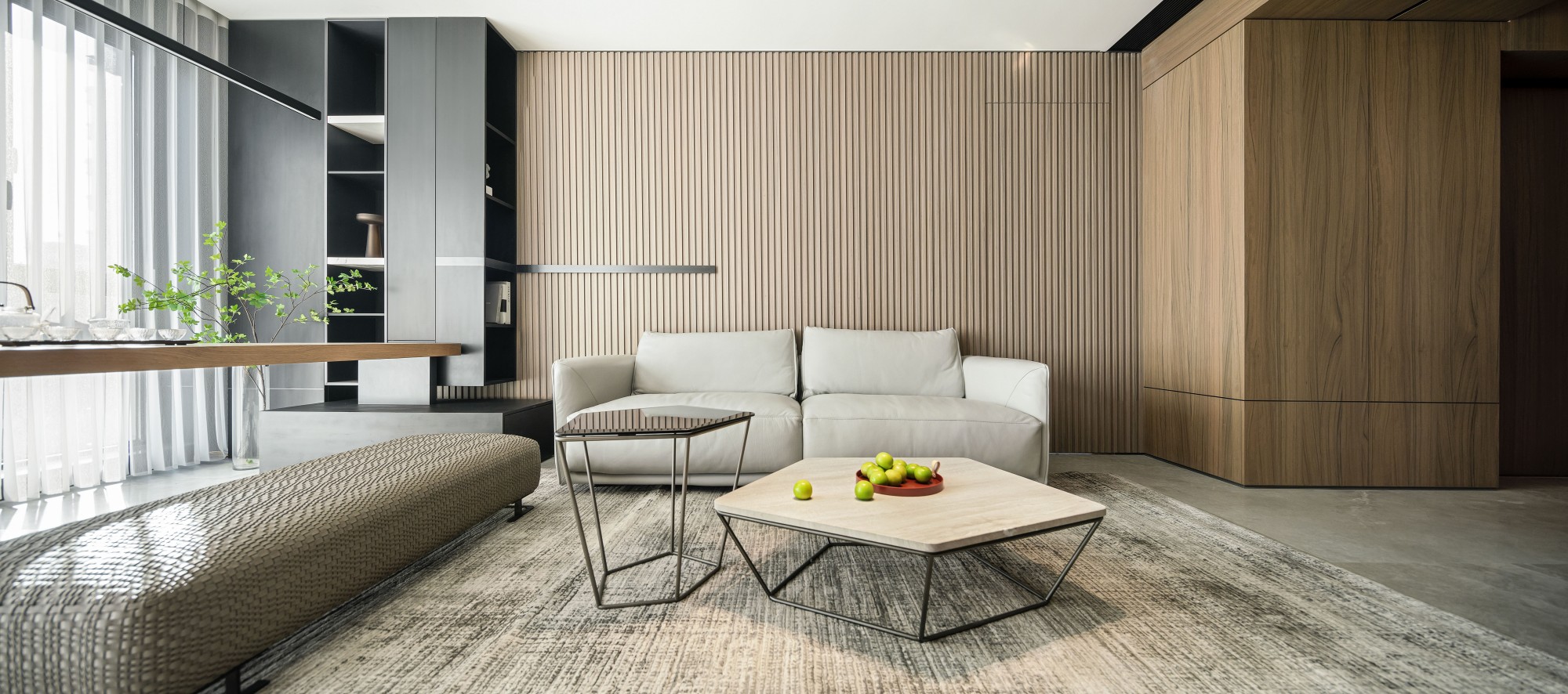 竖纹木饰面墙像揉碎的日光,裹着浅灰沙发的柔软;金属框茶几、编织长凳带着“冷与暖”的对话,连置物柜都用“半隐半显”的节奏,把生活物件变成空间的装饰。坐在这里,窗外的光会顺着纱帘漫进来,连呼吸都慢半拍。