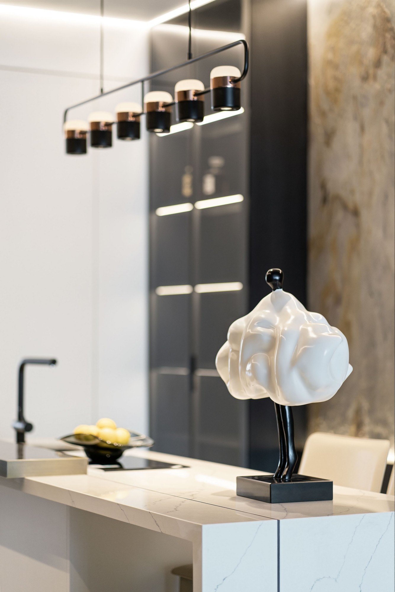 大理石岛台是“烟火与体面”的纽带——一边是铜色灯轨衬着岩板墙的冷调高级,一边是云朵灯、柠檬果盘的软萌;