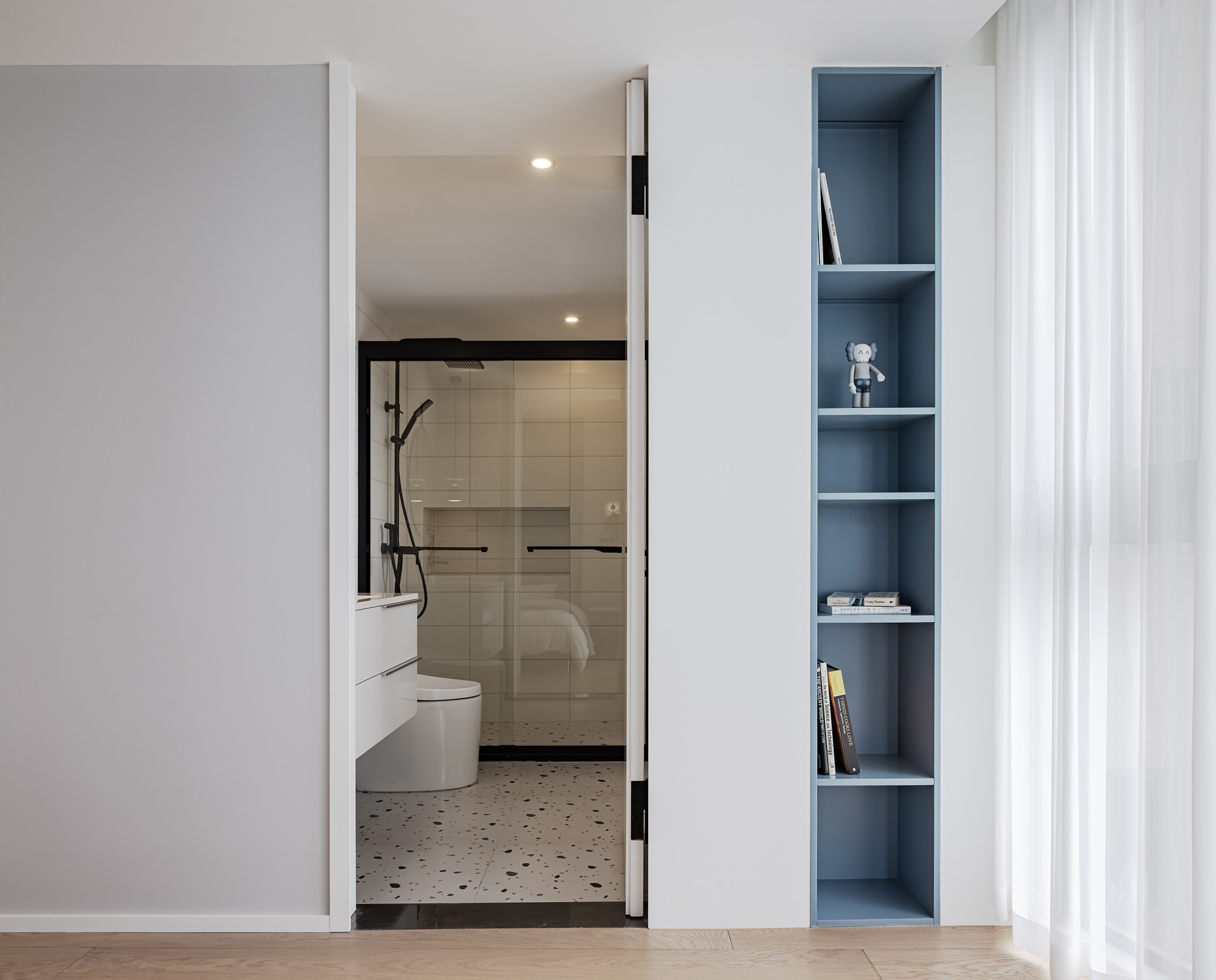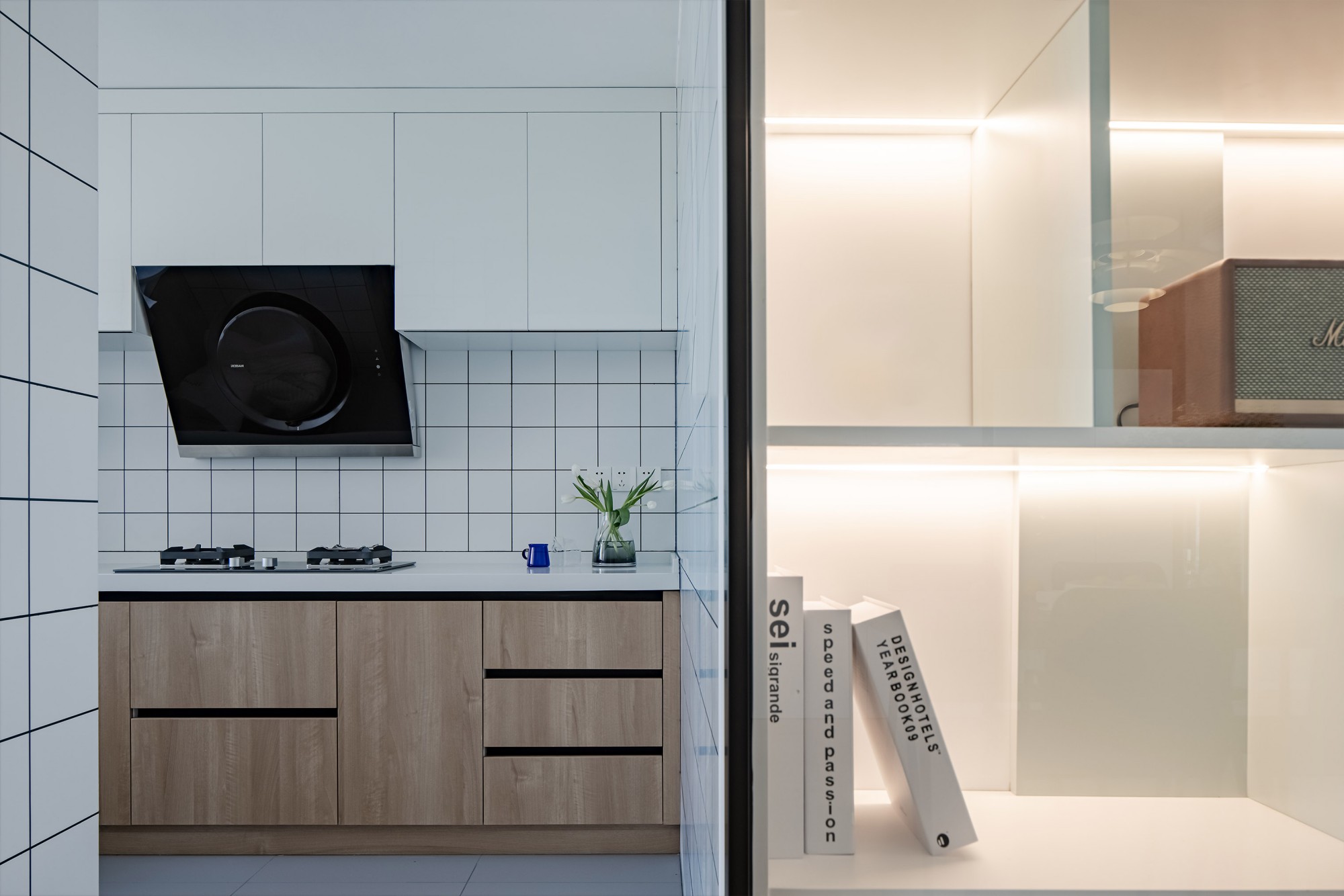 旁边的玻璃隔层摆了书和香薰,做饭时抬眼就是温柔,连油烟都像轻了半分。