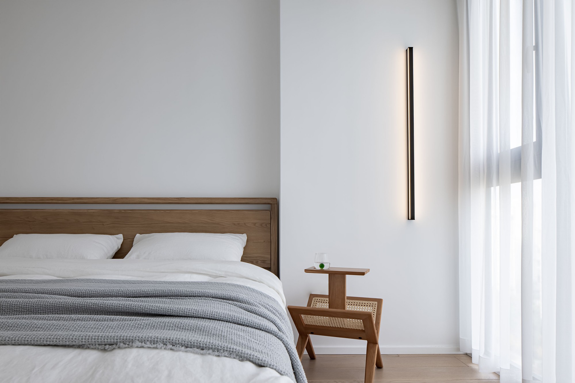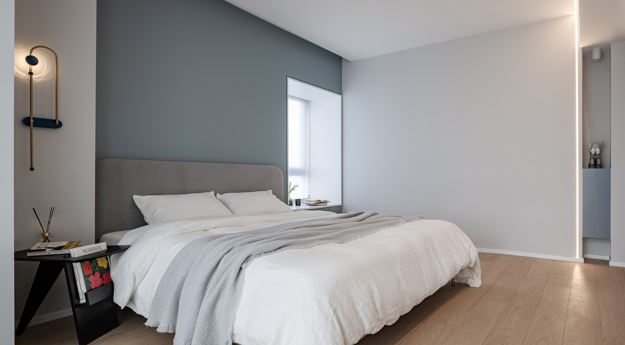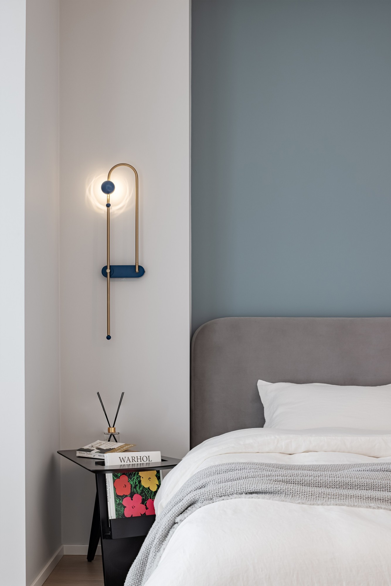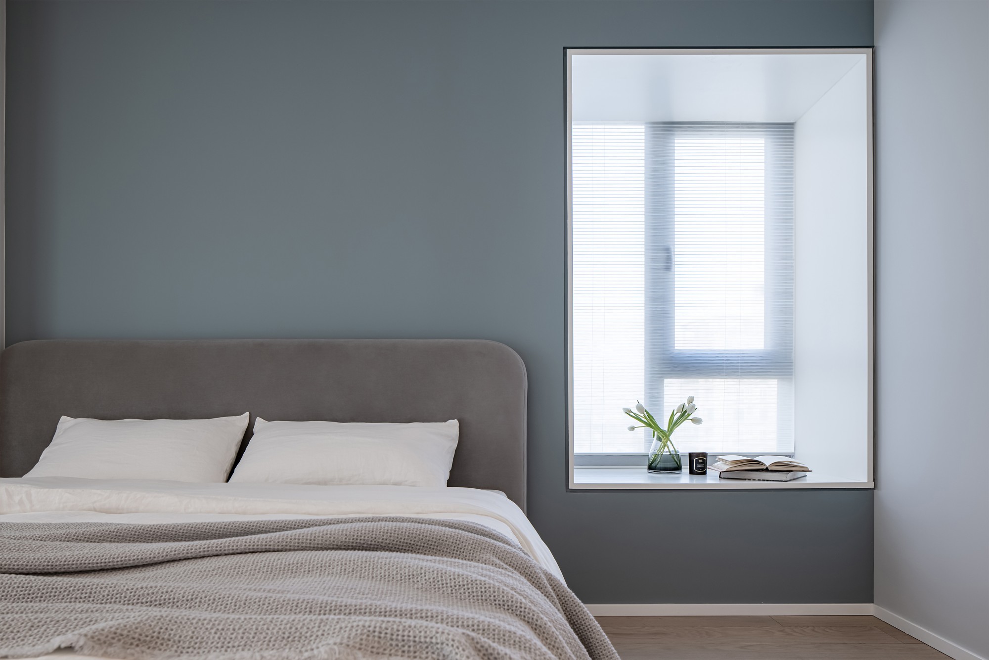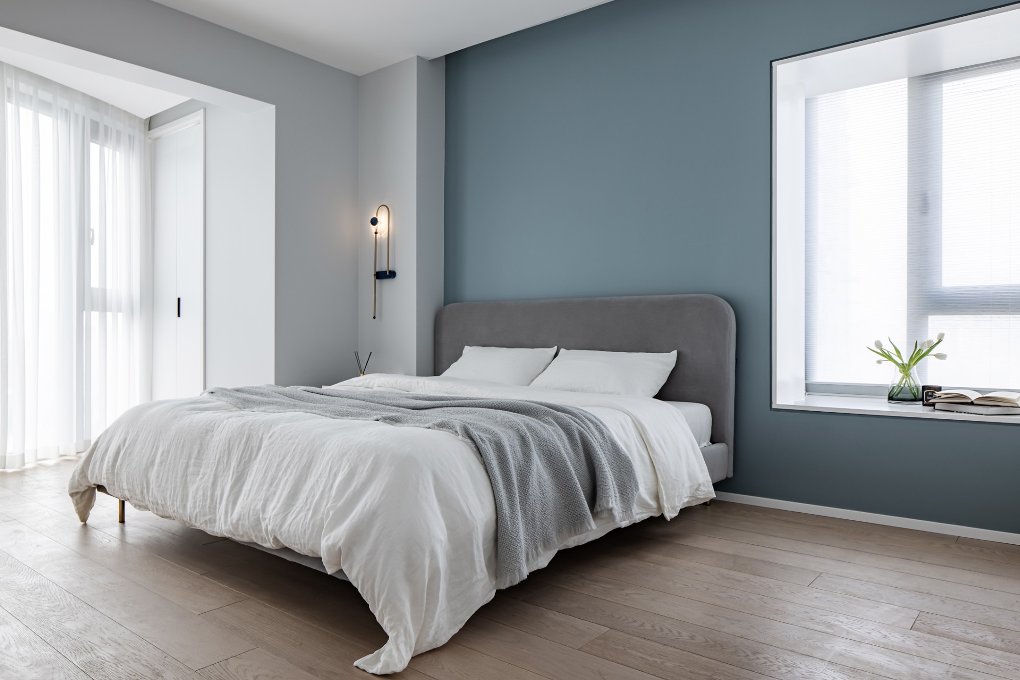 雾霾蓝墙面像睡前的一杯温牛奶,软包床头、褶皱床品裹着蓬松的安全感,壁灯的光揉在窗帘里,连梦都是轻的。