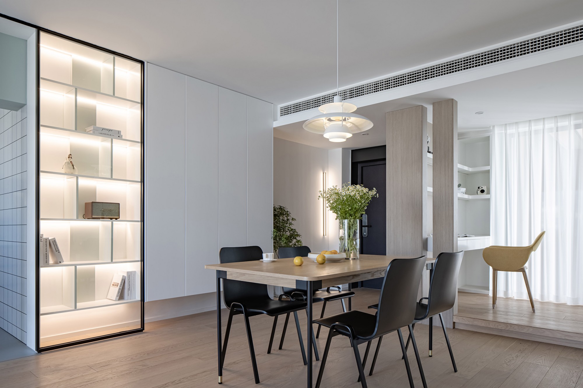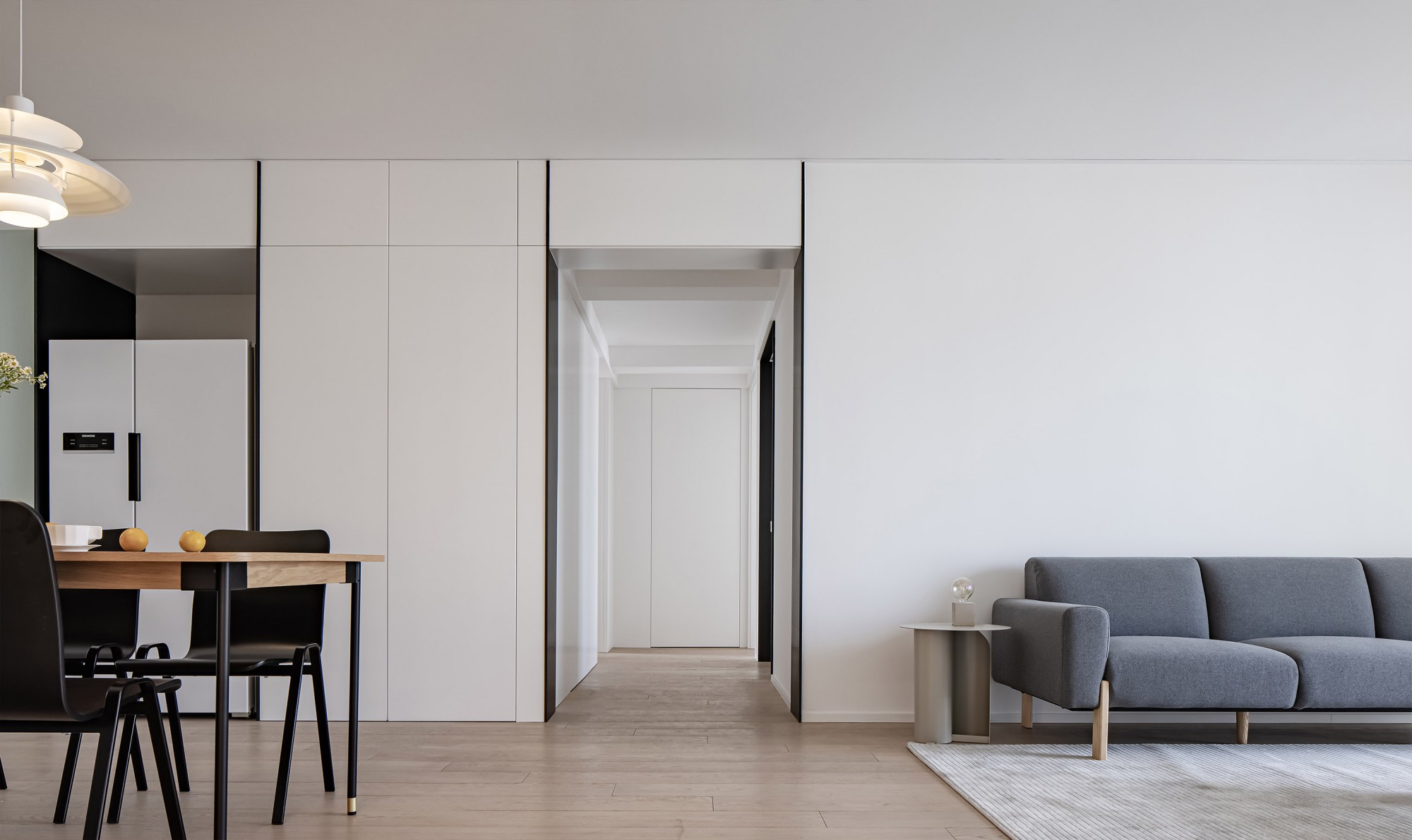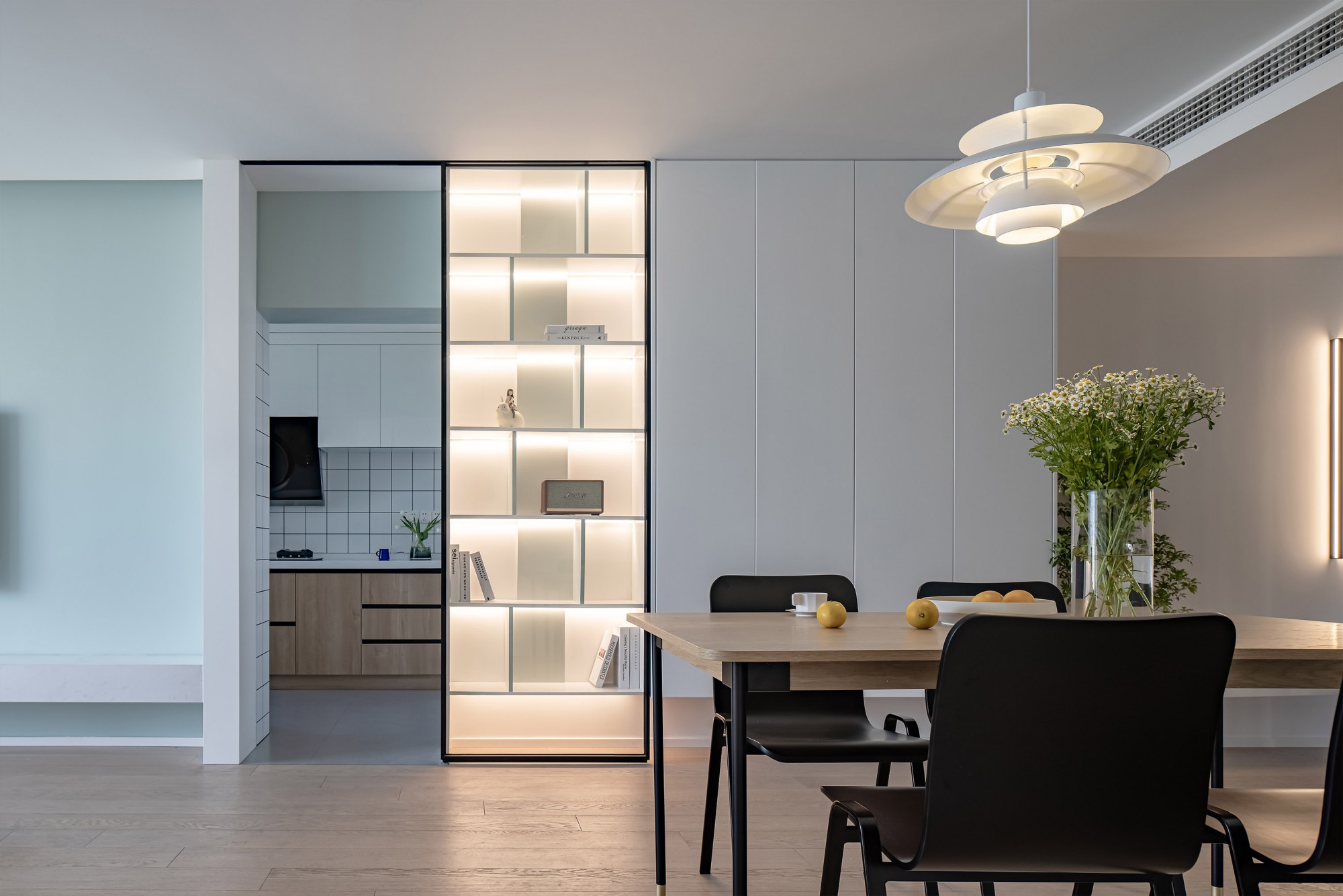 餐边柜藏起锅碗瓢盆,留个开放格摆束小雏菊,连冰箱都“隐身”在柜面里——好看和实用,原来不用二选一。