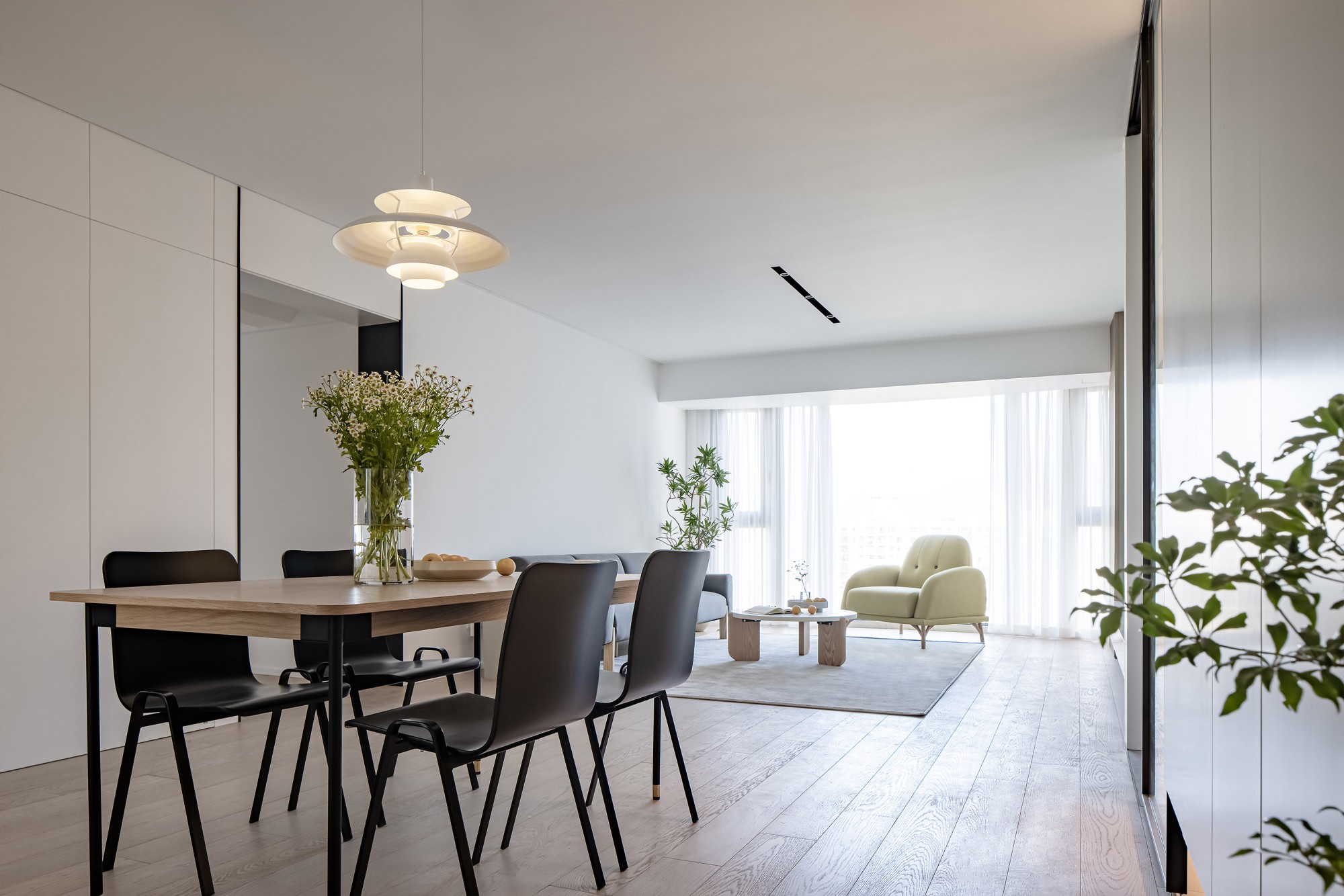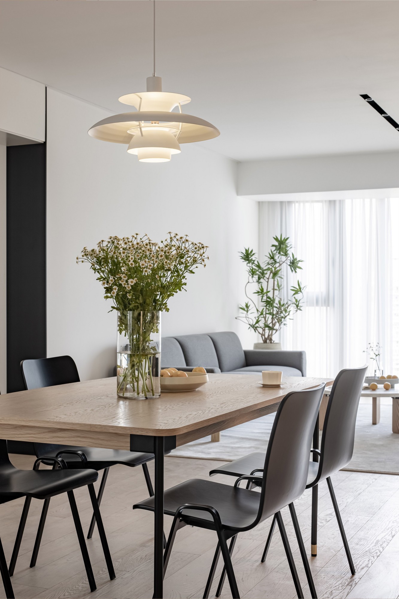 黑白灰里掺了点原木暖调,长桌+皮质椅是“日常吃饭”和“朋友小聚”的中间解。