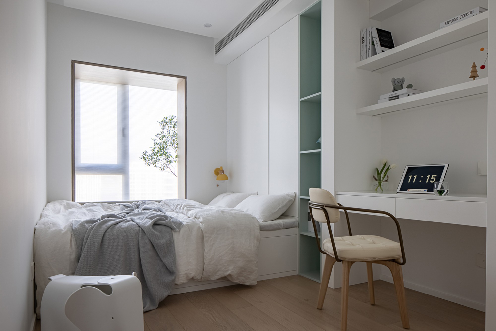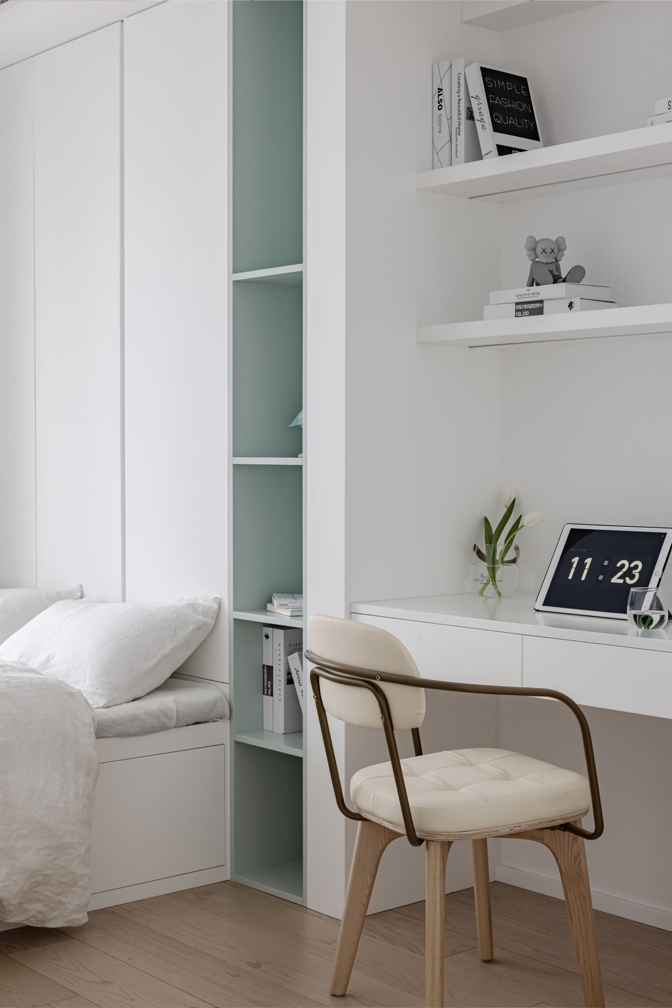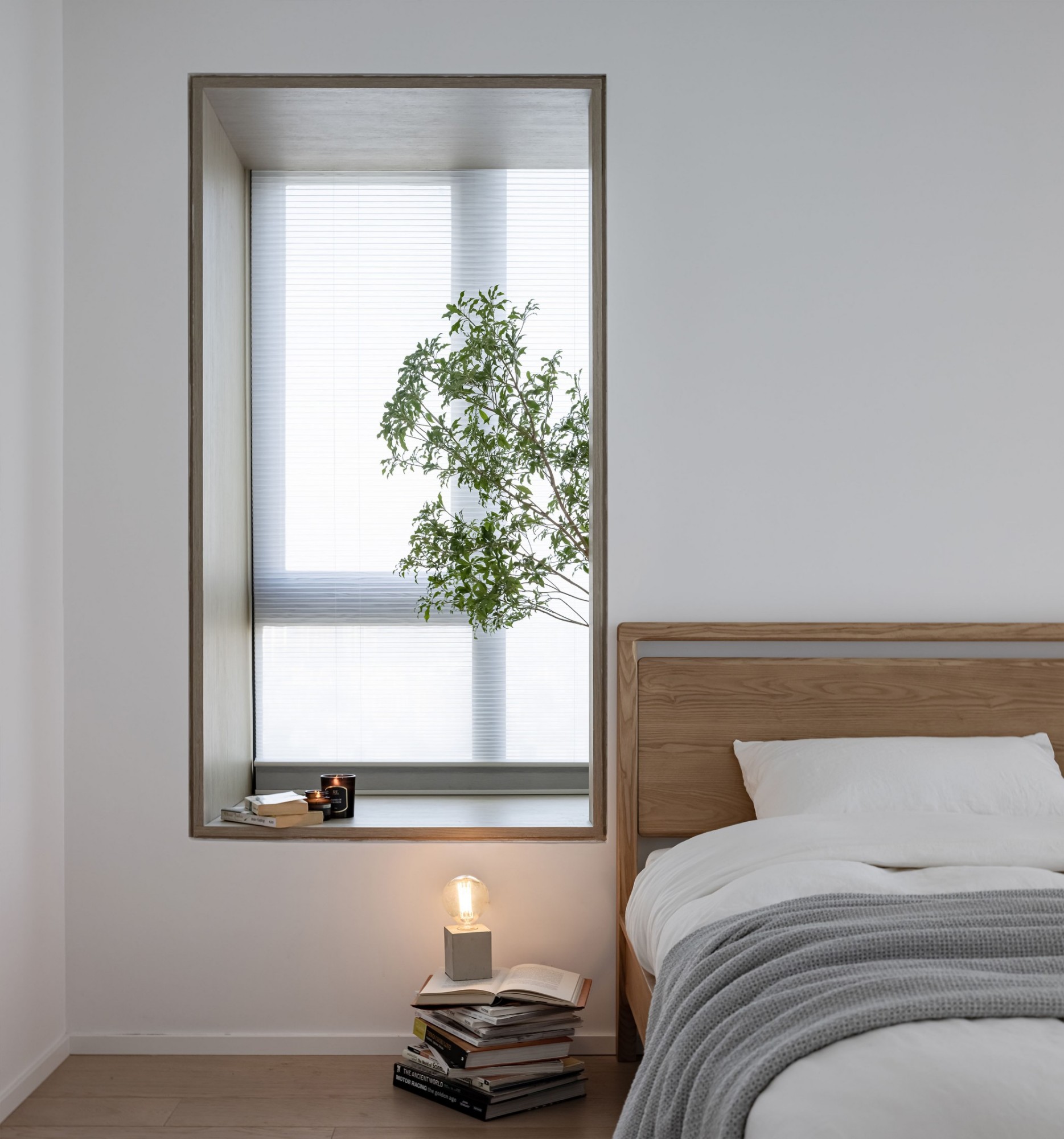 窗边的小台面上,书和花正等着“睡前翻两页”的温柔时刻——家的意义,不过是把日子过成“醒来就开心”的样子。