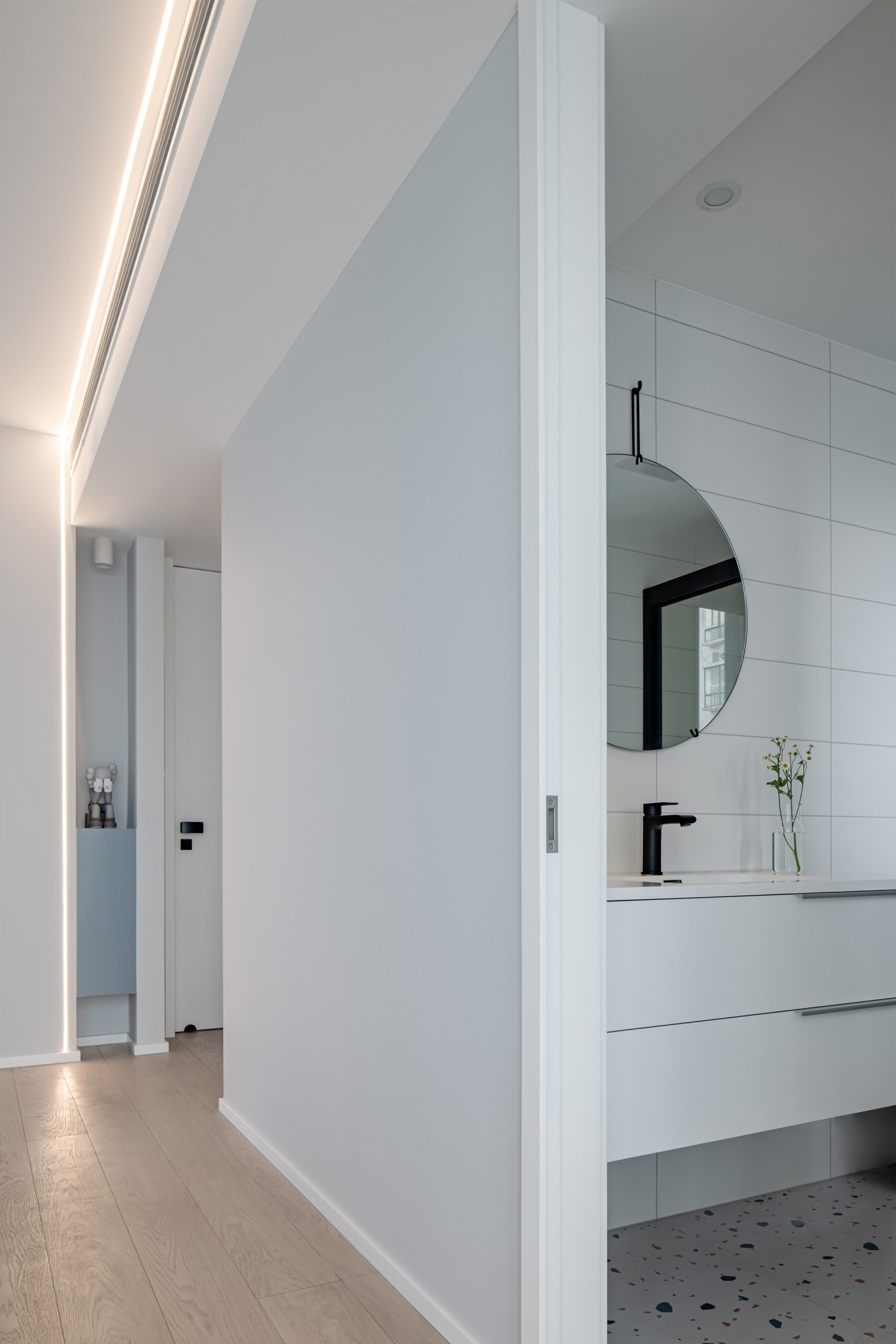 浅灰大砖拉满高级感,悬浮柜+黑龙头是“冷调里的暖意”,花洒的水落在瓷砖上,连独处的时间都变得安静又舒展。