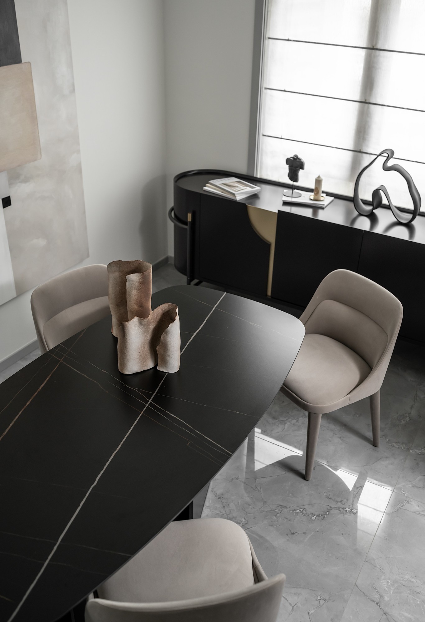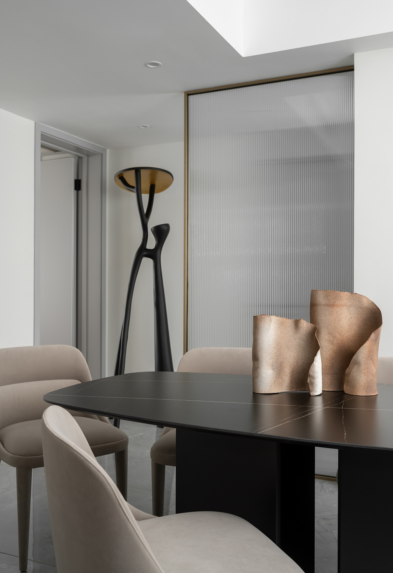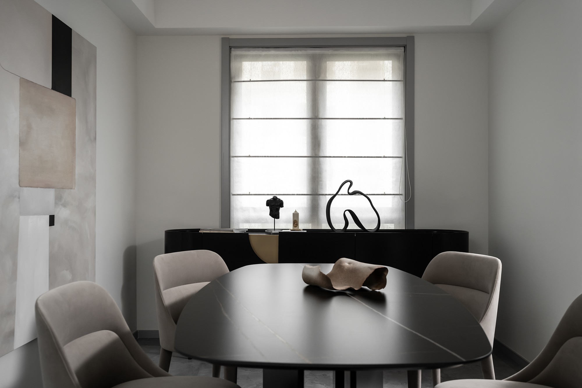 窗边的黑色曲线摆件、金属烛台,是小而精的轻奢点缀,百叶窗透进来的柔光,让整个用餐区既冷静又有温度。