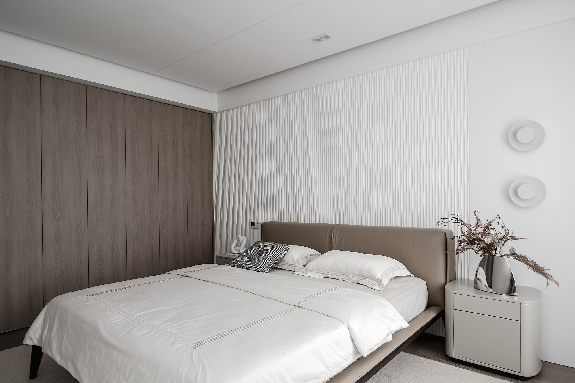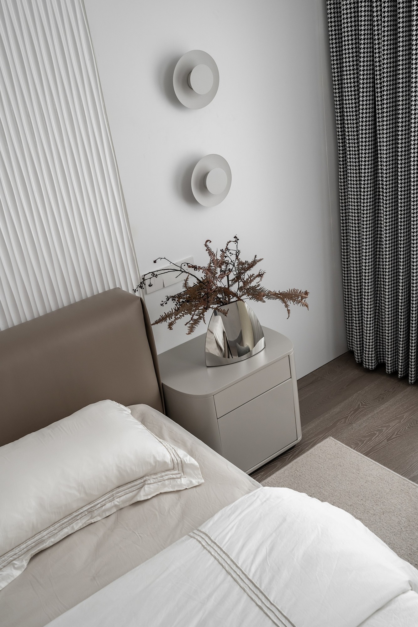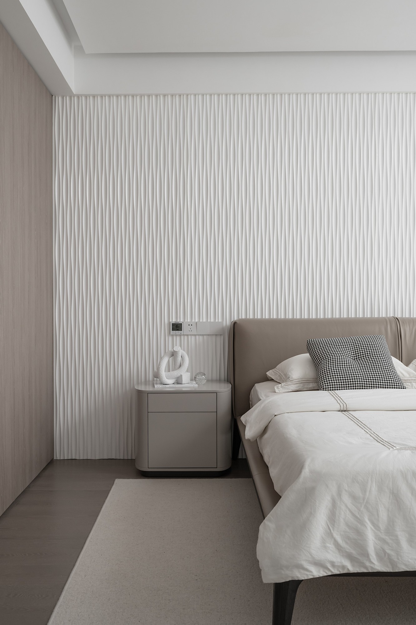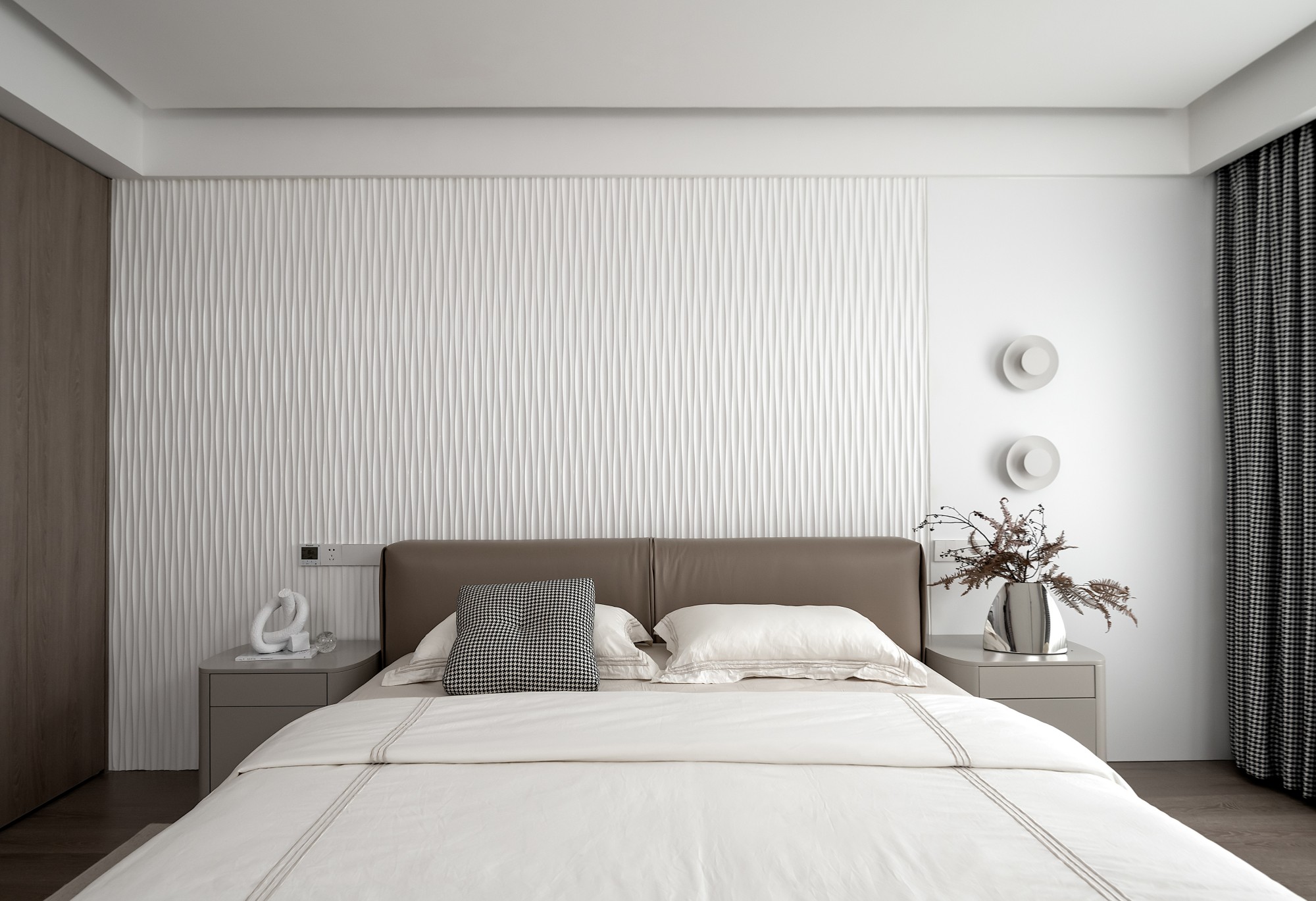 背景墙的竖纹肌理板,让纯白空间有了细腻的层次变化;深棕色皮质床头带着低调的奢华感,千鸟格抱枕再次呼应客厅元素,让空间风格更统一。