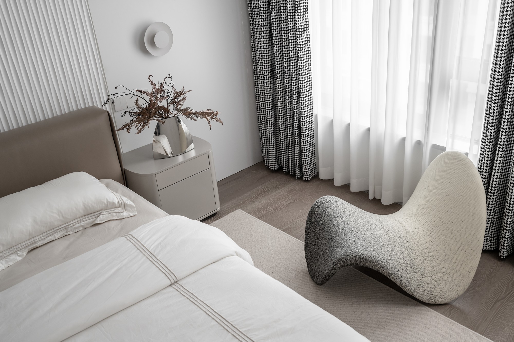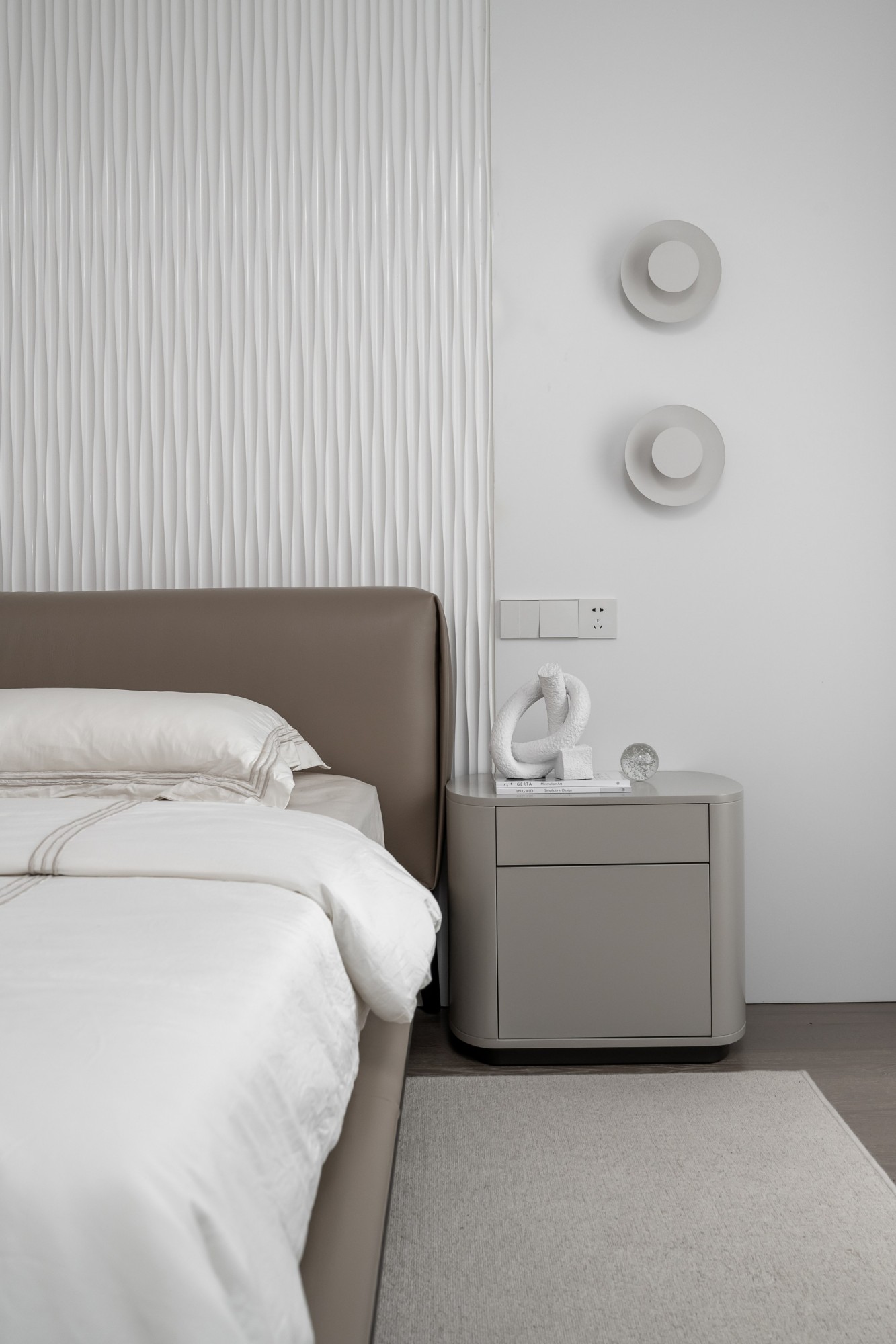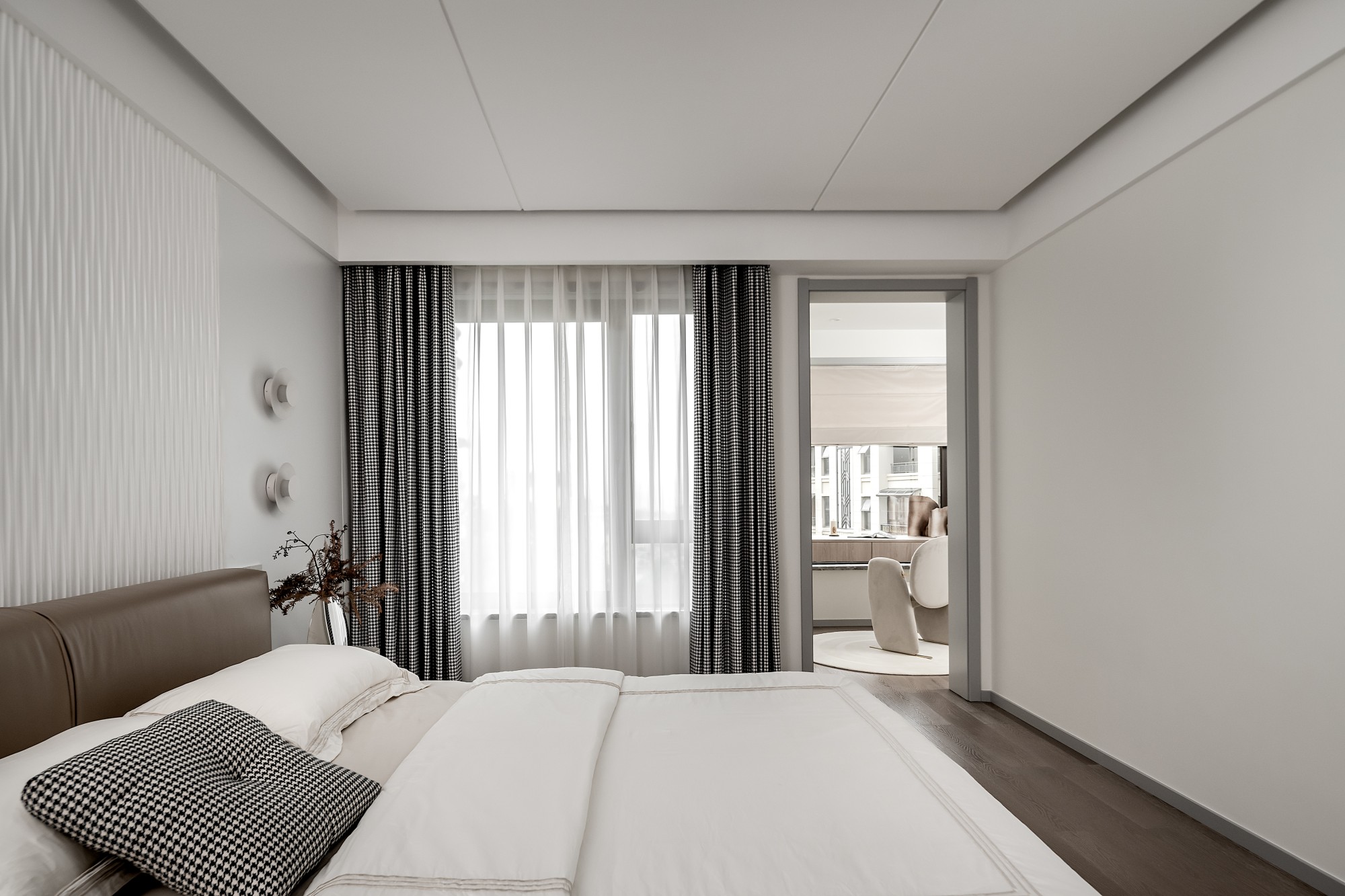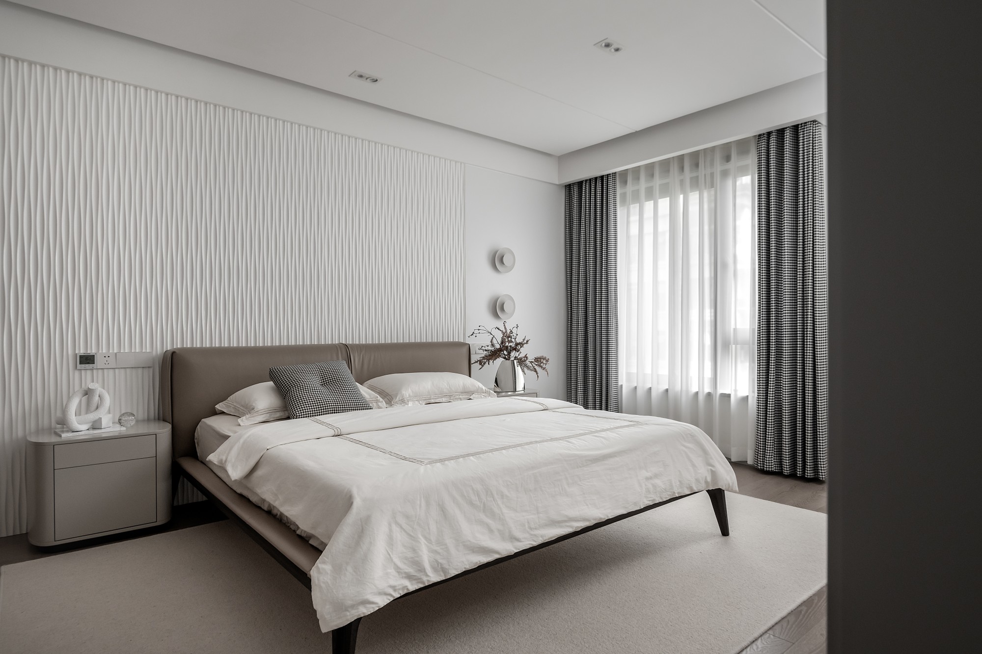 背景墙的竖纹肌理板,让纯白空间有了细腻的层次变化;深棕色皮质床头带着低调的奢华感,千鸟格抱枕再次呼应客厅元素,让空间风格更统一。