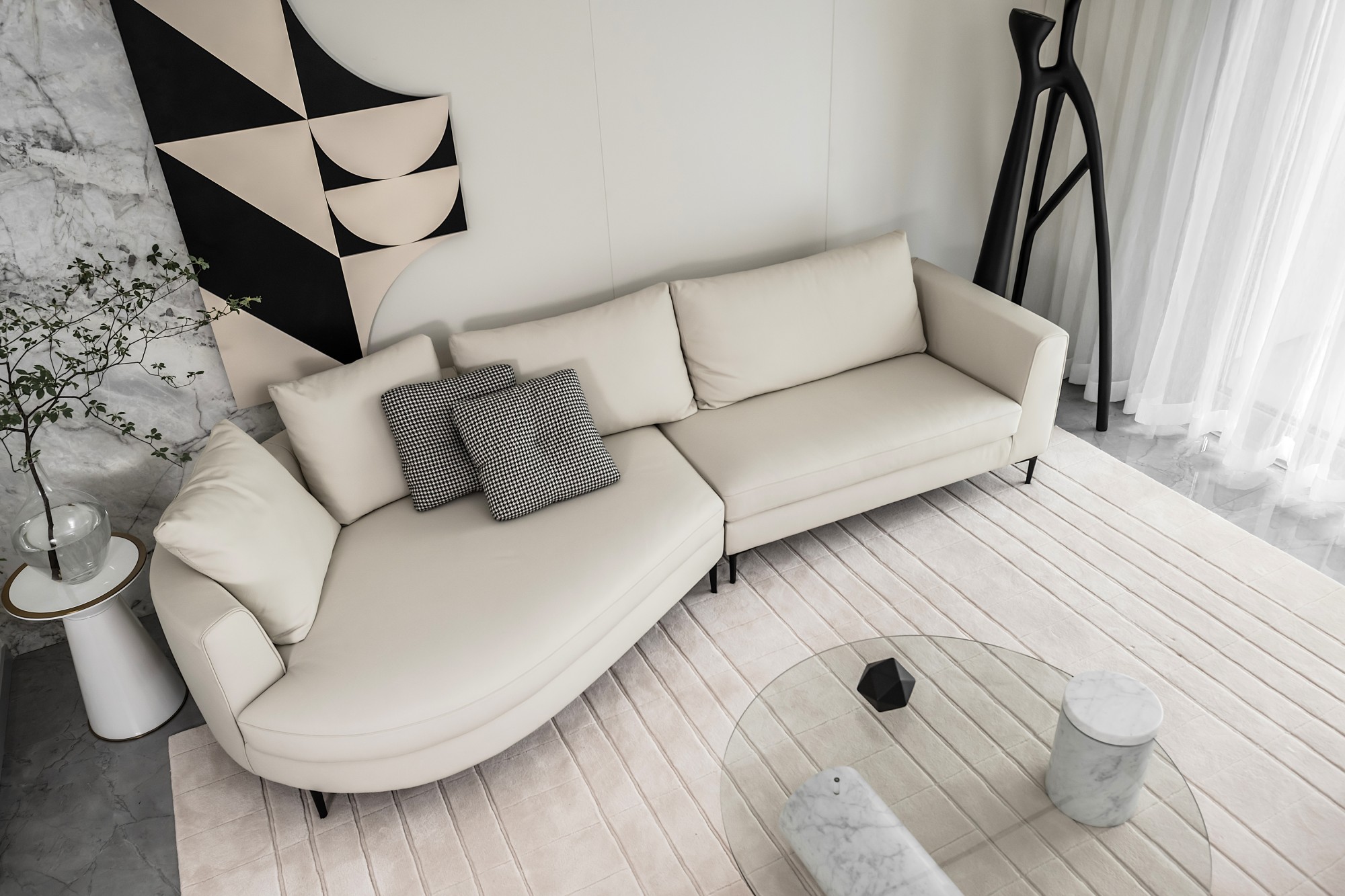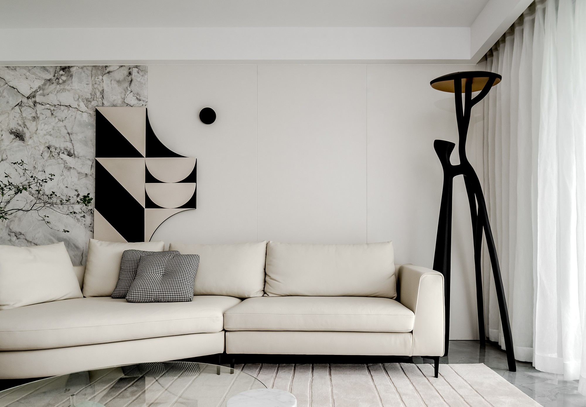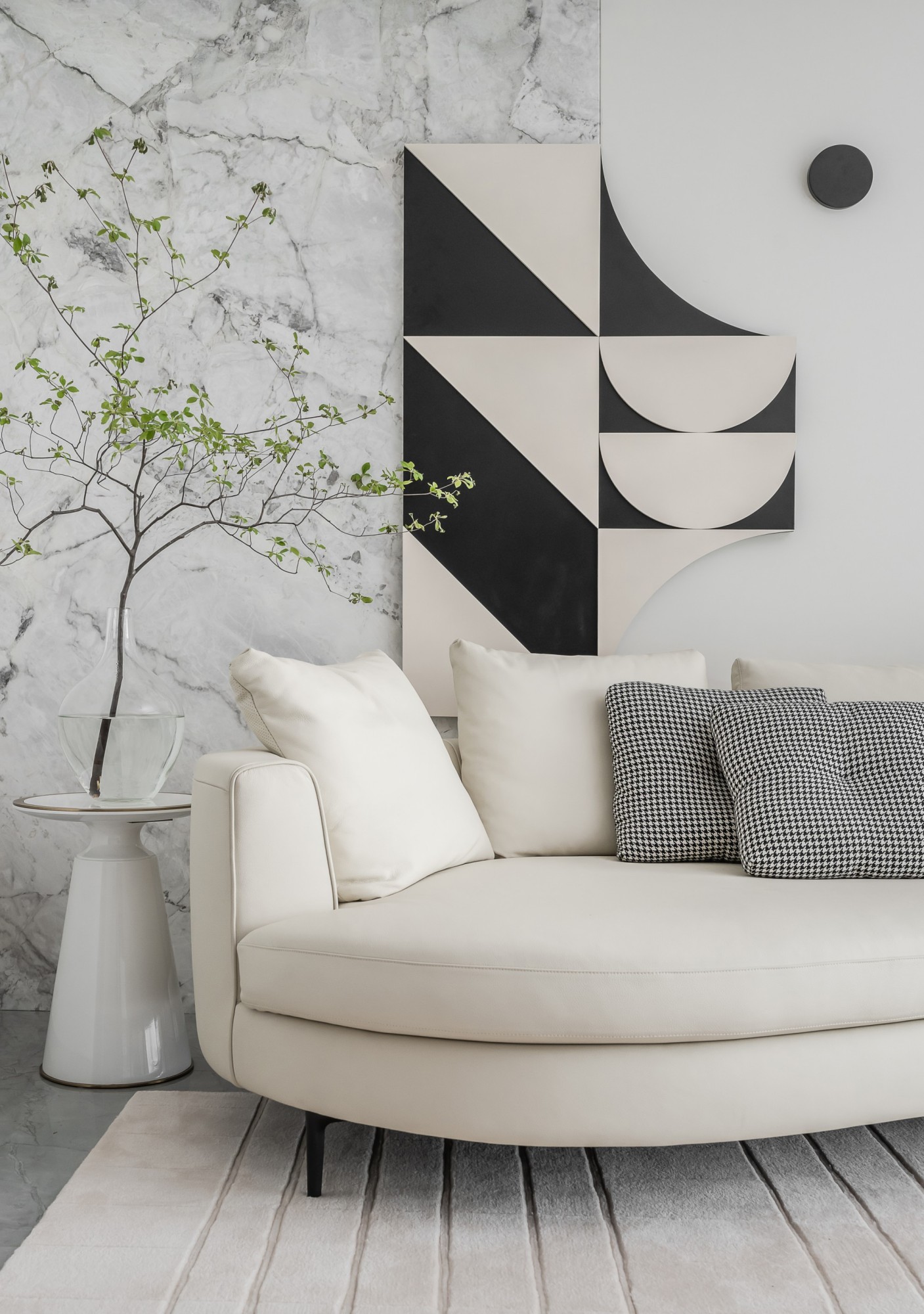 弧形米白沙发自带慵懒松弛感,搭配千鸟格抱枕,在纯色基底里添了复古细节;背景墙一半是大理石纹理的冷调高级,一半是奶白护墙板的柔和,中间的几何装饰画用黑/米色块打破单调,又和沙发抱枕形成呼应。