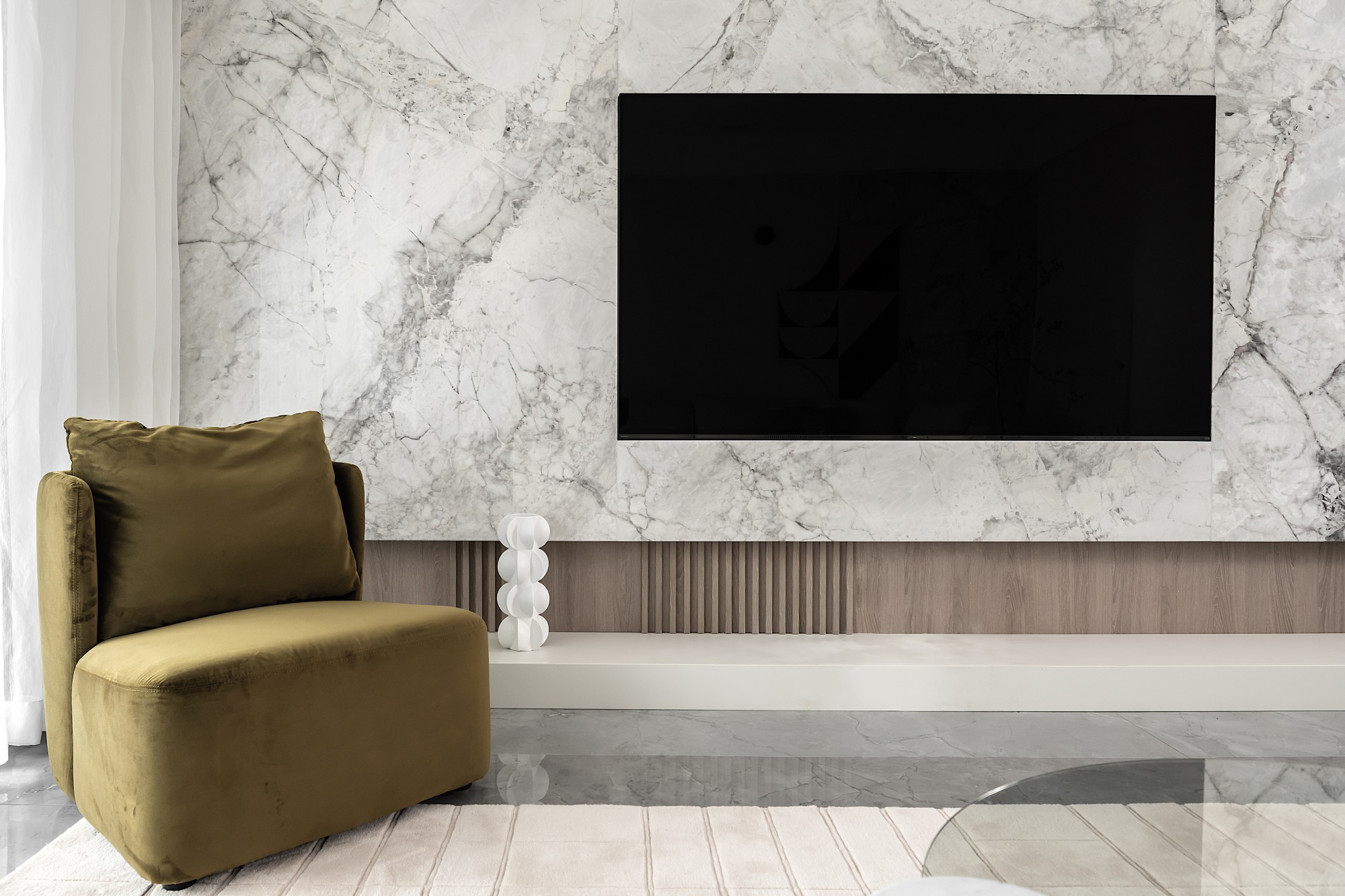 玻璃圆茶几+大理石底座的组合,把“轻”与“奢”平衡得刚好;旁边的橄榄绿单人椅是点睛的暖调,配上造型感十足的黑色落地灯,让空间在极简里多了艺术张力。