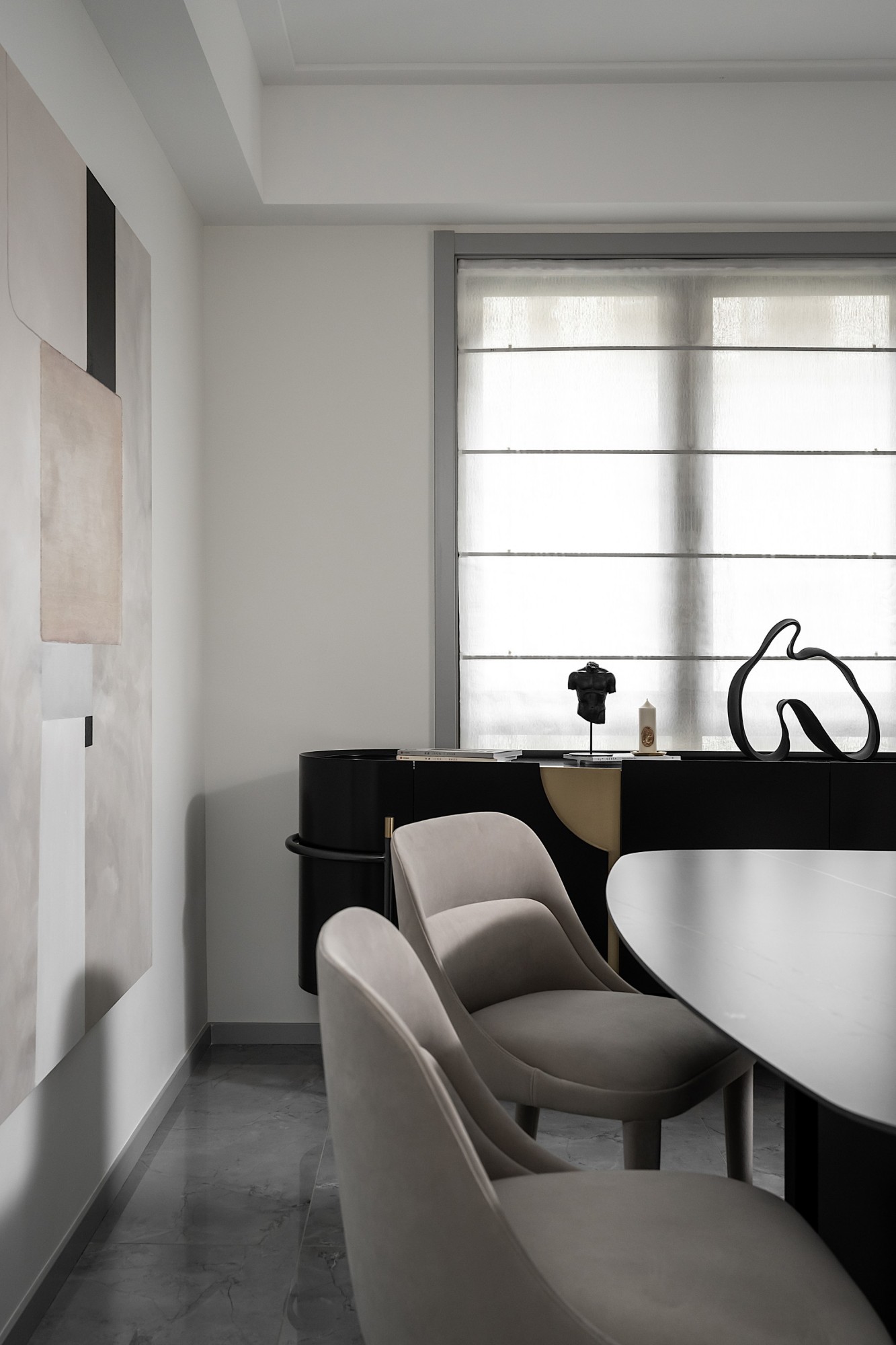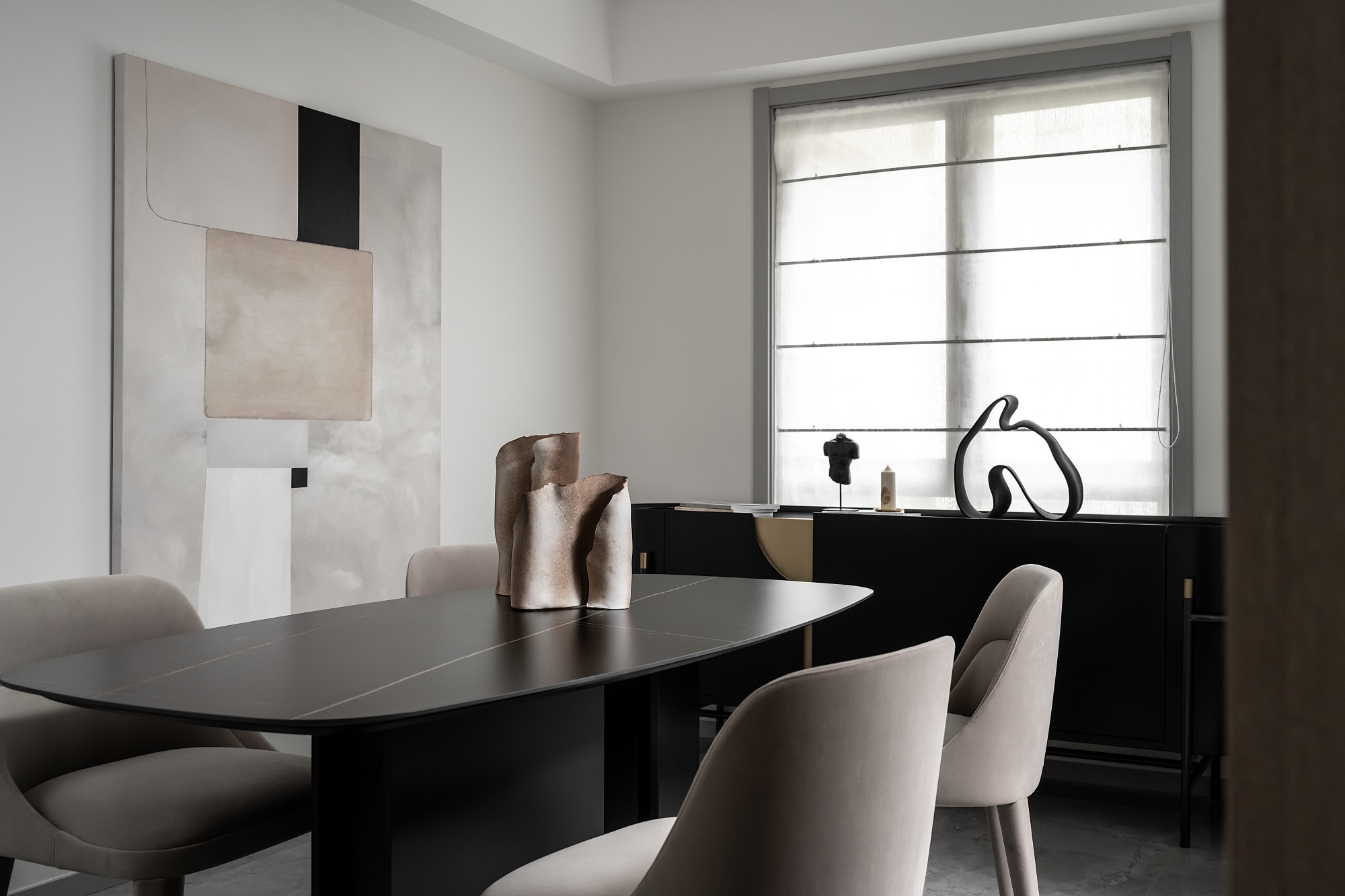 深色餐桌和浅米色餐椅形成明暗对比,餐椅的弧形靠背又柔化了深色的厚重感;墙面的拼贴装饰画,用不同肌理的米/灰/黑块,和餐桌的色调无缝衔接。