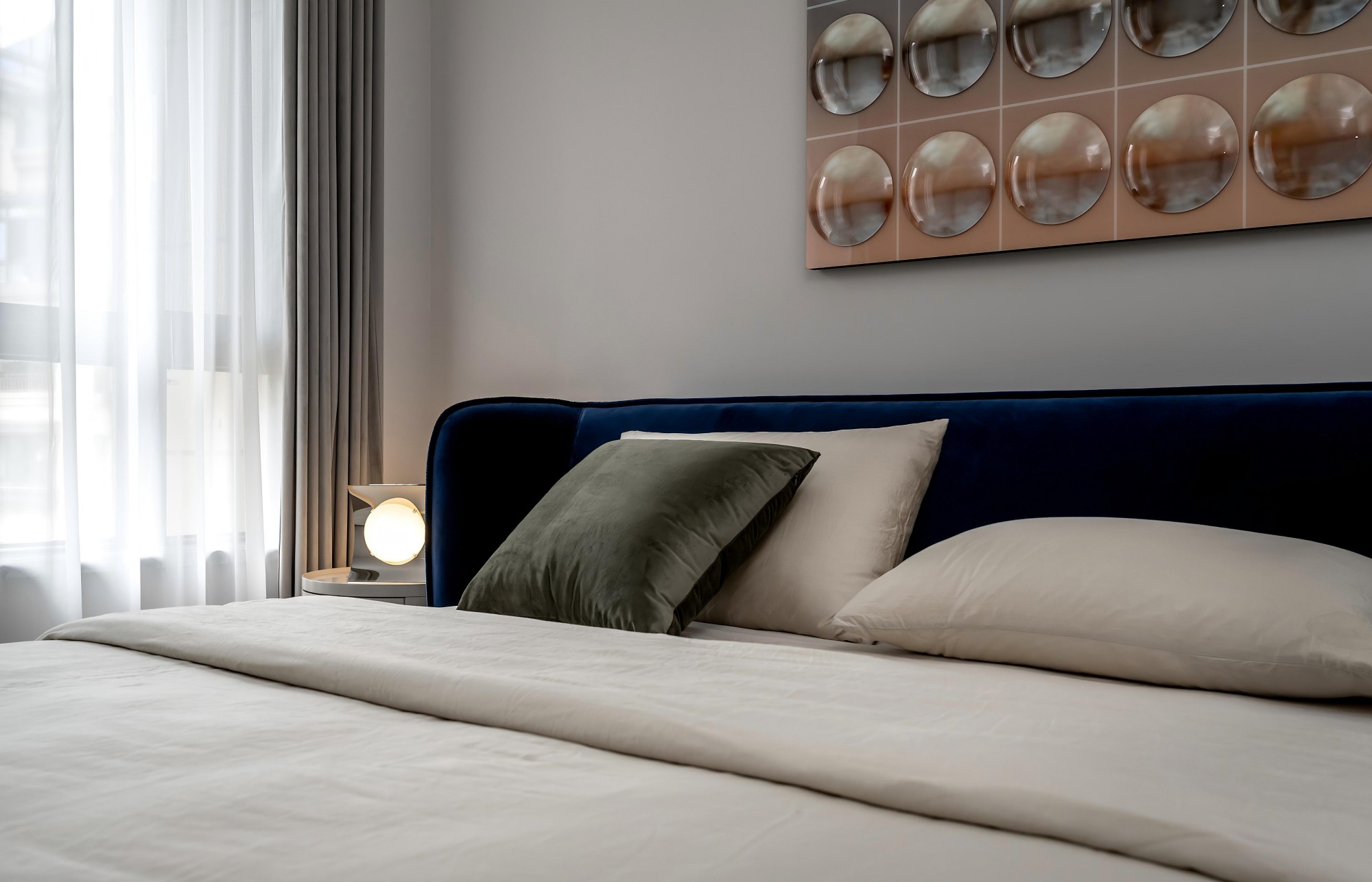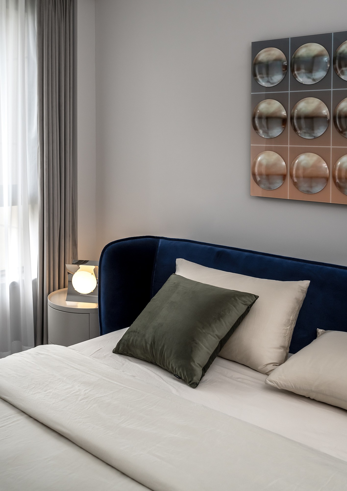 浅灰床品+深灰绒面抱枕,搭配肌理感床头,用同色系的不同材质制造层次;墙面的黑色抽象装饰画,是冷调里的艺术锐度,又和深灰窗帘形成呼应。