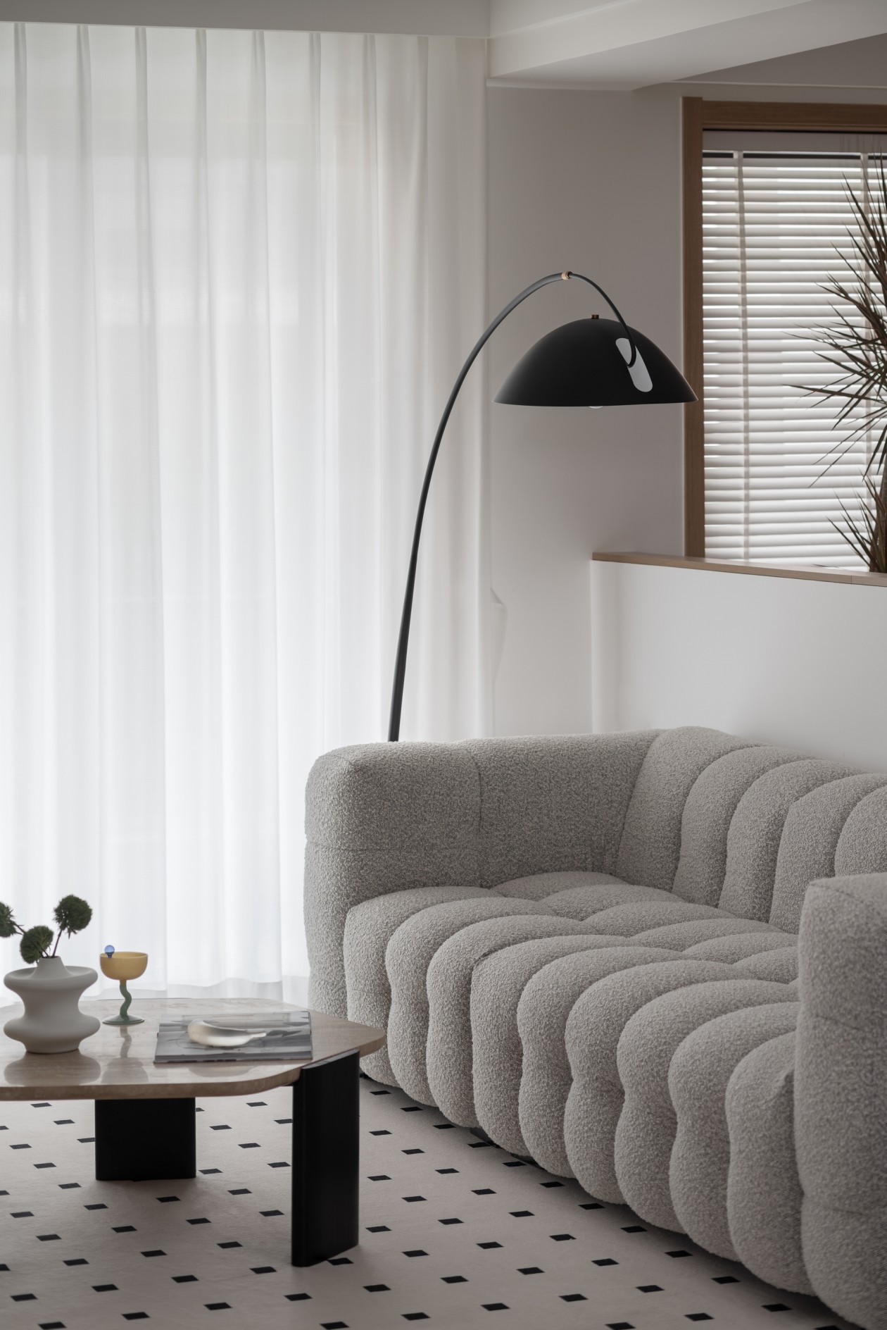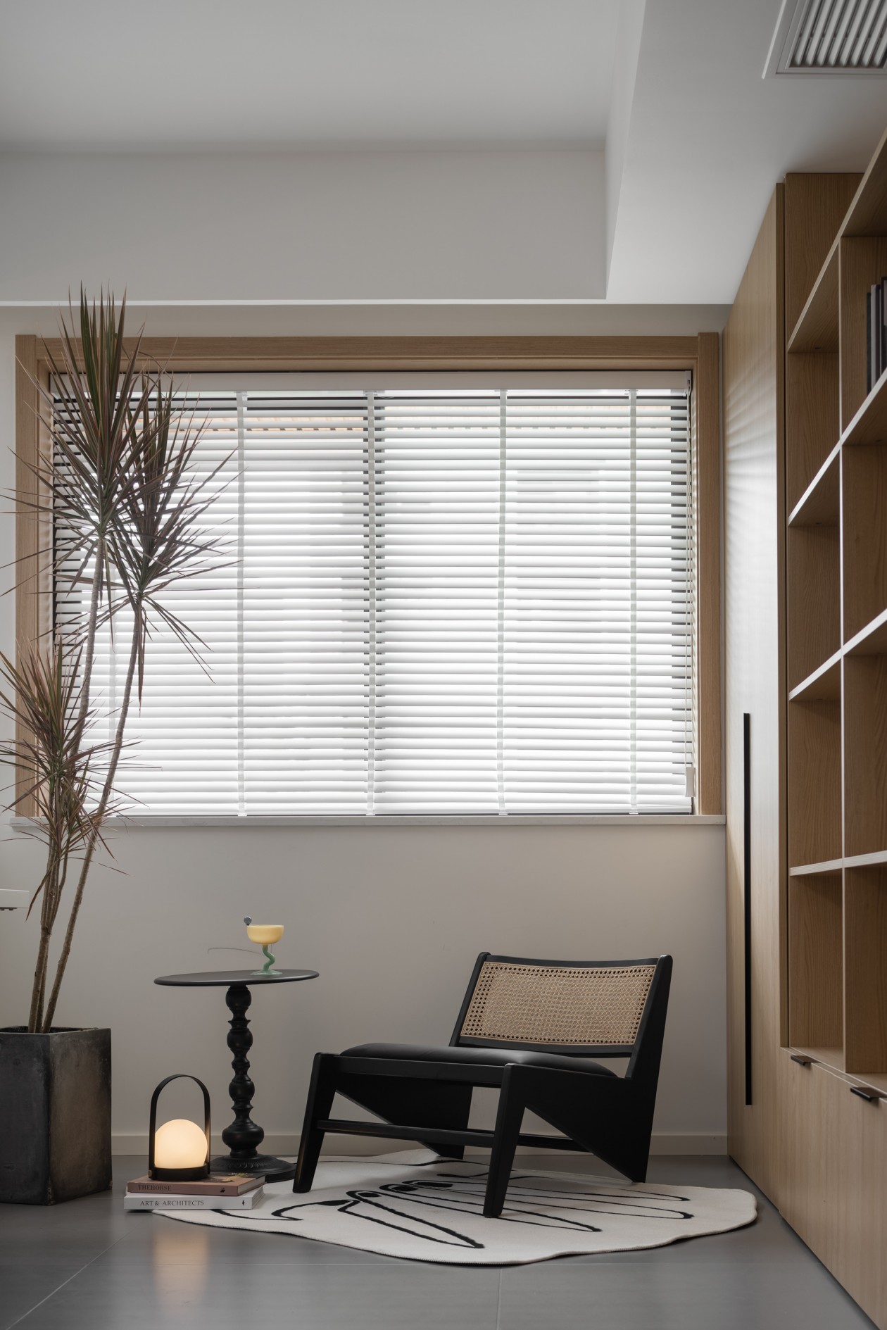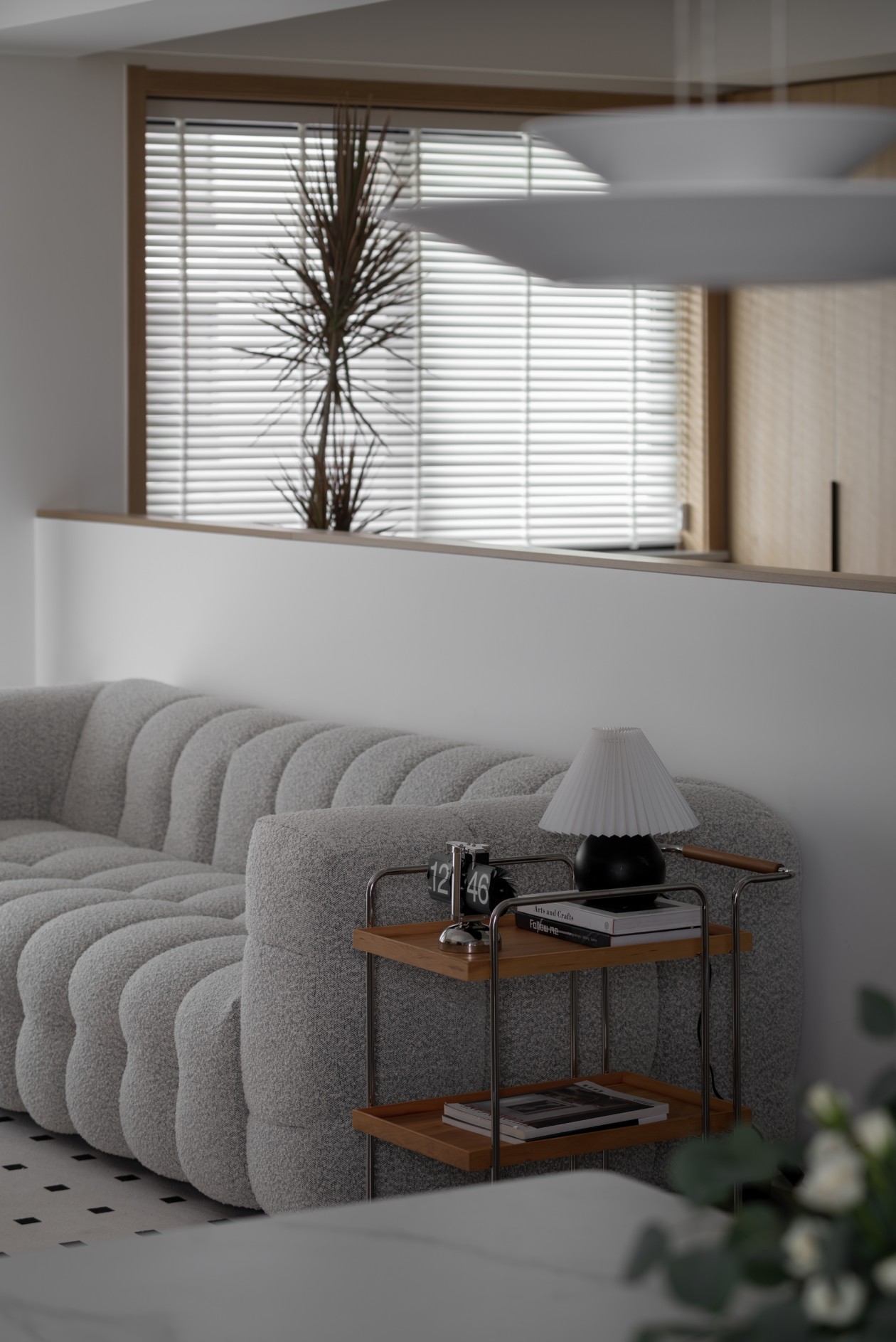 黑色小狗坐墩、金属推车边几是点睛的“轻酷”细节,落地灯的暖光一洒,整个区域都裹着慵懒的氛围感。